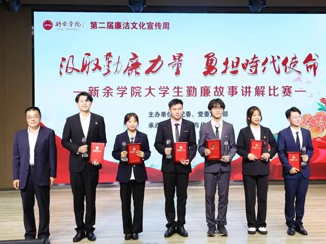 本次比赛由选手刘先翔讲解周恩来的勤廉故事拉开帷幕,选手们精心准备,将饱满的感情投入故事的讲解当中。在铿锵有力的语调中展现了每一位选手对于勤廉的理解和对故事人物的敬佩。一生投入女子高中办学事业的张桂梅、勤政为民攻坚克难的焦裕禄、献身于荒山成就了林海的杨善洲等慷慨激昂的故事讲解使观众响起热烈掌声。最终,文学与传媒学院李艺荣获一等奖,文学与传媒学院齐梦甜和公共卫生与健康学院杨金娥荣获二等奖,新能源科学与工程学院黄灿等名选手分别获得三等奖和优胜奖。颁奖结束后,校领导和选手上台合影。