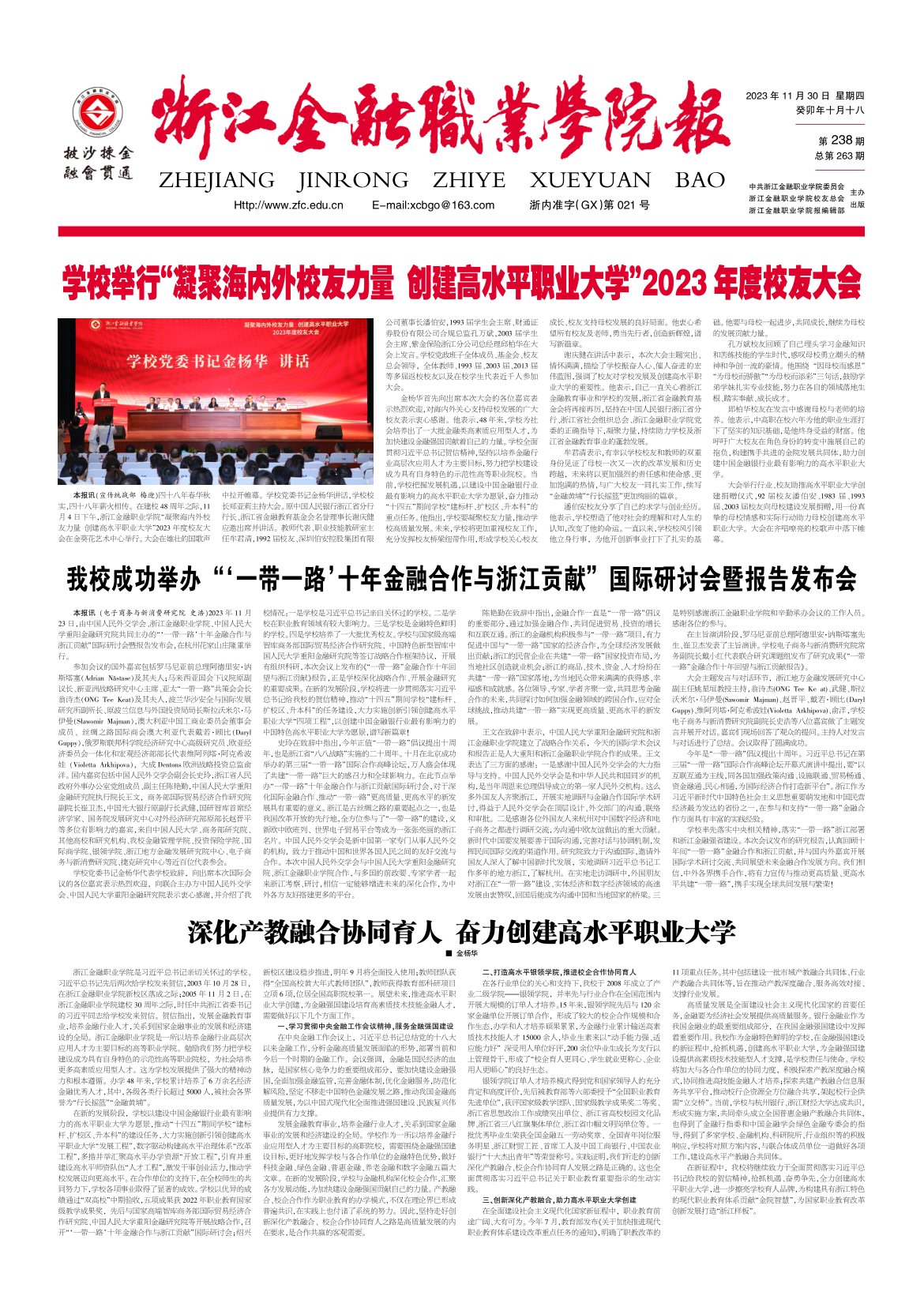本报讯(电子商务与新消费研究院 史浩)2023年11月23日,由中国人民外交学会、浙江金融职业学院、中国人民大学重阳金融研究院共同主办的“‘一带一路’十年金融合作与浙江贡献”国际研讨会暨报告发布会,在杭州花家山庄隆重举行。