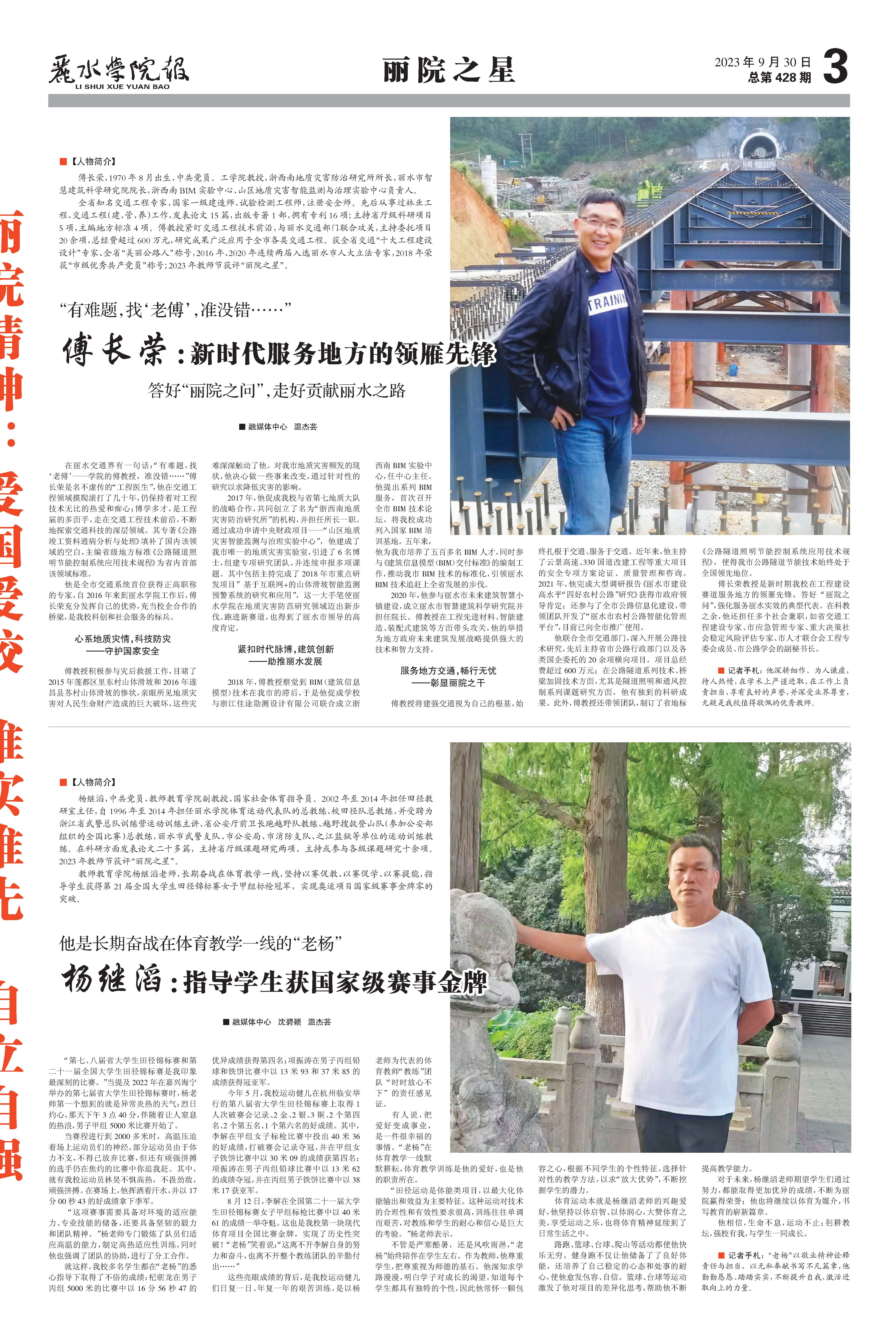 【人物简介】傅长荣,1970年8月出生,中共党员。工学院教授,浙西南地质灾害防治研究所所长,丽水市智慧建筑科学研究院院长,浙西南BIM实验中心、山区地质灾害智能监测与治理实验中心负责人。