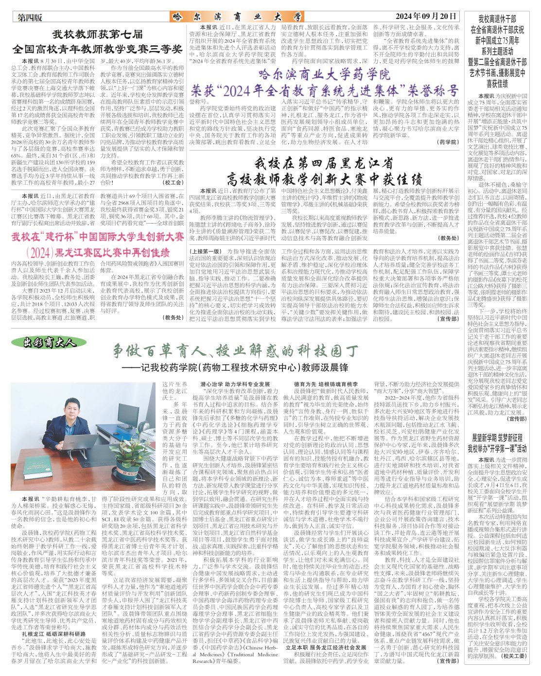 汲晨锋,我校药学院(药物工程技术研究中心)教师,从教二十余载始终躬耕于教学科研工作一线,爱岗敬业,作风严谨,用实际行动和言传身教教育引导学生弘扬和传承中华传统美德,培育和践行社会主义核心价值观,培养了大批德才兼备的高层次人才。荣获“2023年度黑龙江省师德先进个人”“黑龙江省高层次人才”,入围“龙江科技英才春雁支持计划科技创新领军人才团队”,入选“黑龙江省研究生导学思政团队”,并多次获得哈尔滨商业大学优秀研究生导师、优秀共产党员、先进工作者等荣誉称号。