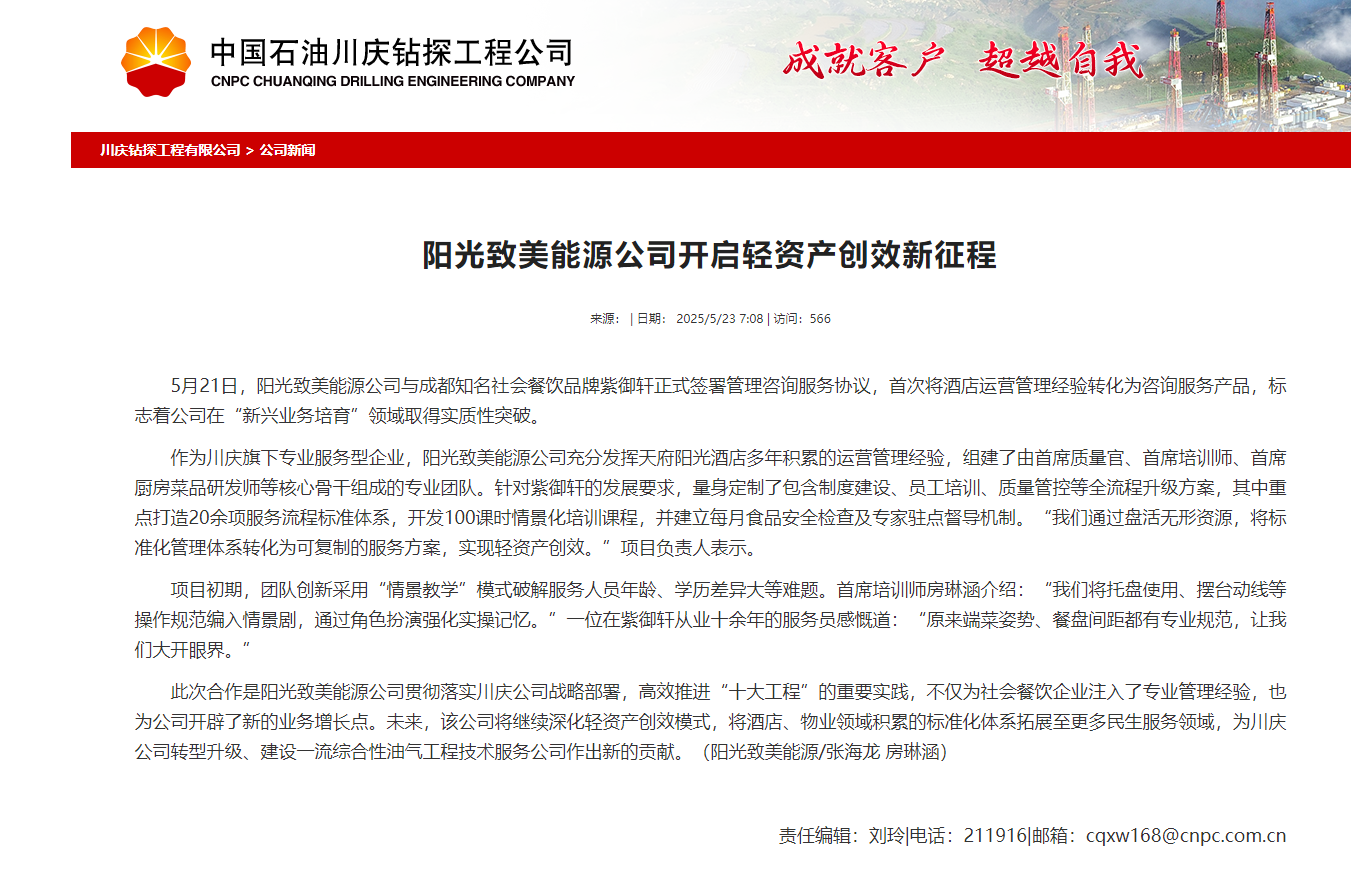 此次合作是阳光致美能源公司贯彻落实川庆公司战略部署,高效推进“十大工程”的重要实践,不仅为社会餐饮企业注入了专业管理经验,也为公司开辟了新的业务增长点。未来,该公司将继续深化轻资产创效模式,将酒店、物业领域积累的标准化体系拓展至更多民生服务领域,为川庆公司转型升级、建设一流综合性油气工程技术服务公司作出新的贡献。(阳光致美能源/张海龙 房琳涵)