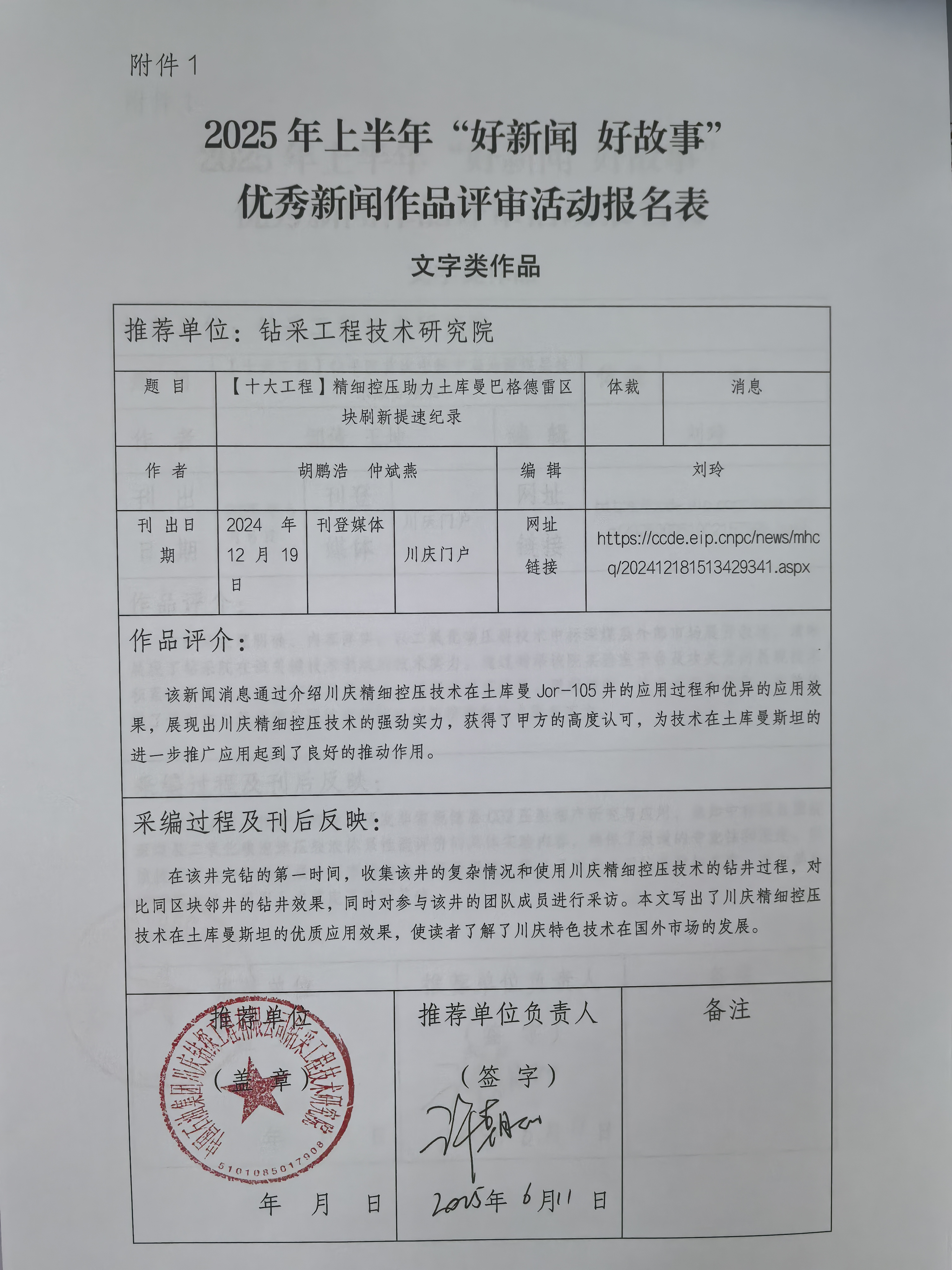 该新闻消息通过介绍川庆精细控压技术在土库曼Jor-105井的应用过程和优异的应用效果,展现出川庆精细控压技术的强劲实力,获得了甲方的高度认可,为技术在土库曼斯坦的进一步推广应用起到了良好的推动作用。 【十大工程】精细控压助力土库曼巴格德雷区块刷新提速纪录