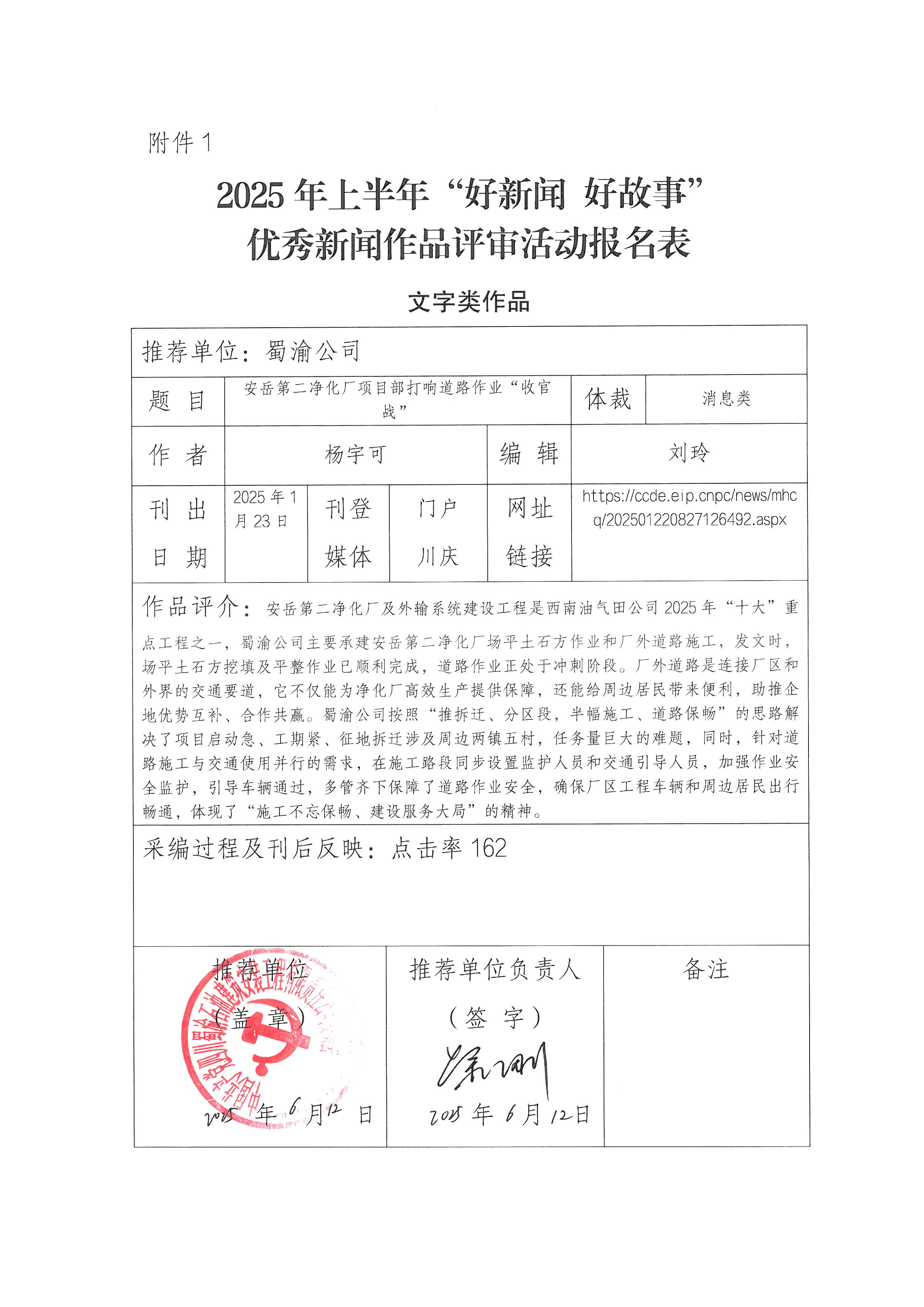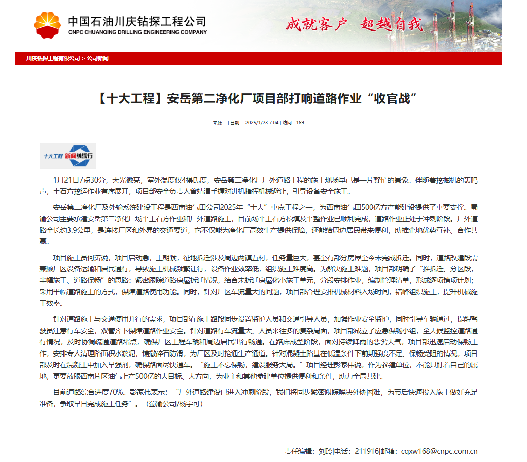 安岳第二净化厂及外输系统建设工程是西南油气田公司2025年“十大”重点工程之一,为西南油气田500亿方产能建设提供了重要支撑。蜀渝公司主要承建安岳第二净化厂场平土石方作业和厂外道路施工,目前场平土石方挖填及平整作业已顺利完成,道路作业正处于冲刺阶段。厂外道路全长约3.9公里,是连接厂区和外界的交通要道,它不仅能为净化厂高效生产提供保障,还能给周边居民带来便利,助推企地优势互补、合作共赢。