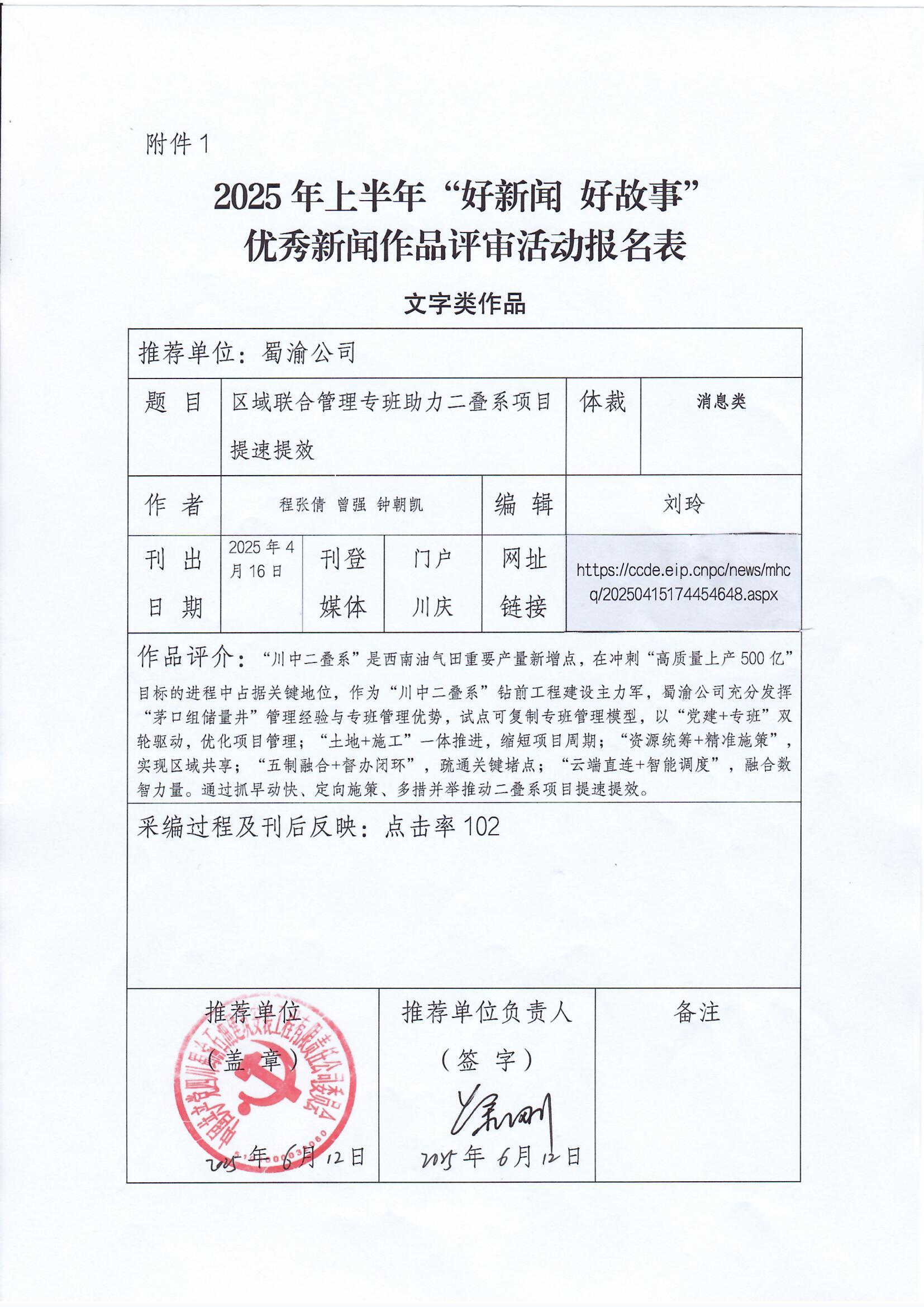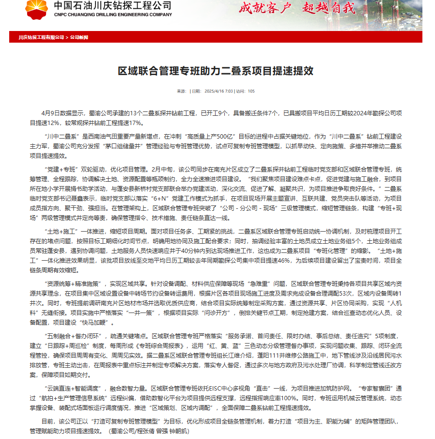 4月9日数据显示,蜀渝公司承建的13个二叠系探井钻前工程,已开工9个,具备搬迁条件7个,已具搬项目平均日历工期较2024年勘探公司项目提速12%,较常规探井钻前工程提速17%。
