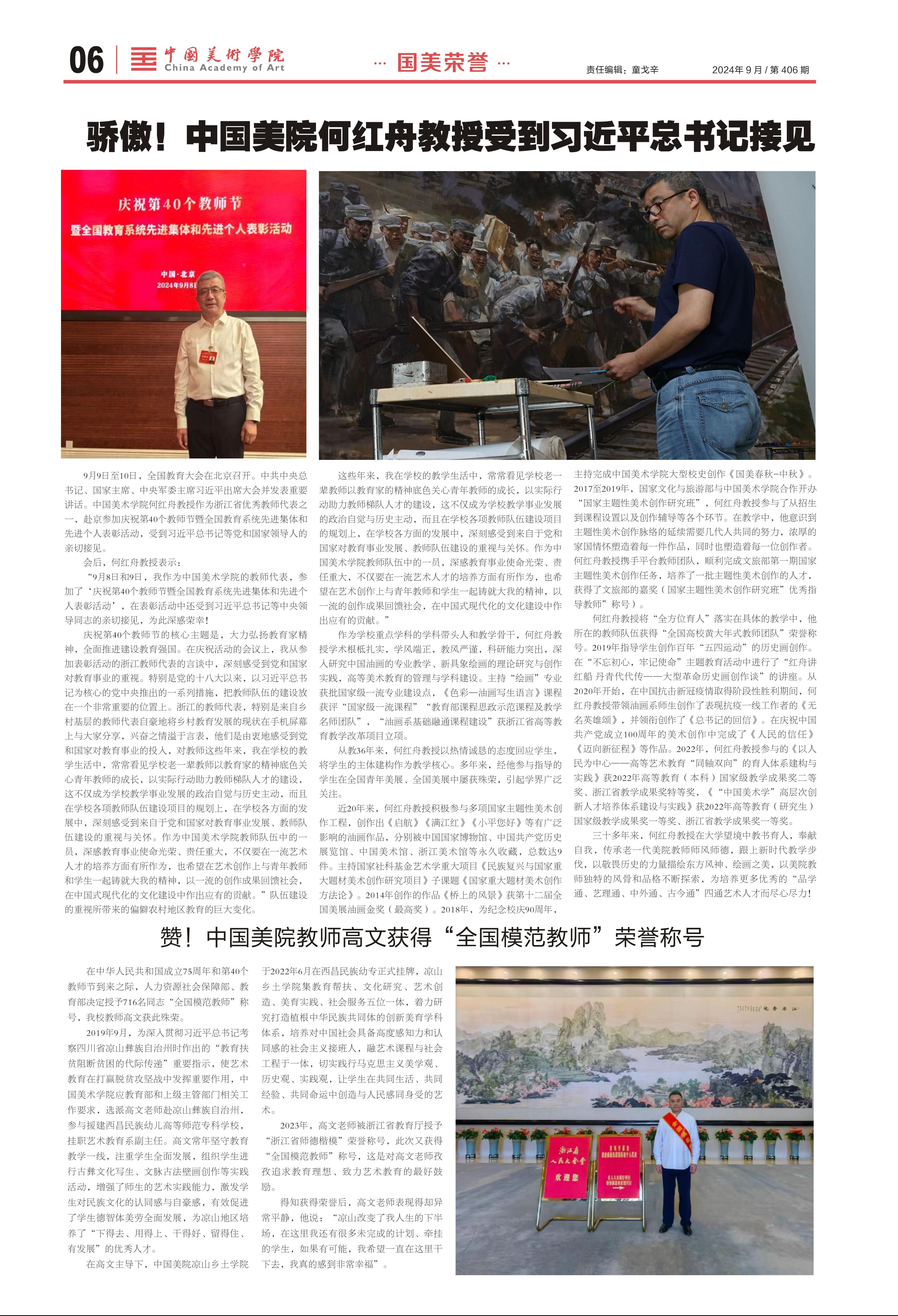 本报讯 9月9日至10日,全国教育大会在北京召开。中共中央总书记、国家主席、中央军委主席习近平出席大会并发表重要讲话。中国美术学院何红舟教授作为浙江省优秀教师代表之一,赴京参加庆祝第40个教师节暨全国教育系统先进集体和先进个人表彰活动,受到习近平总书记等党和国家领导人的亲切接见。