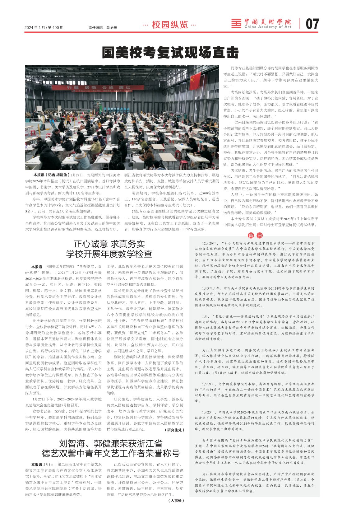 本报讯(记者 胡清盈)2月27日,为期两天的中国美术学院2024年本科招生(复试)在杭州圆满结束。首日考试为中国画、书法学、美术学类及建筑学,27日为设计学类和戏剧与影视学类考试。两天共计1.1万名考生参考。