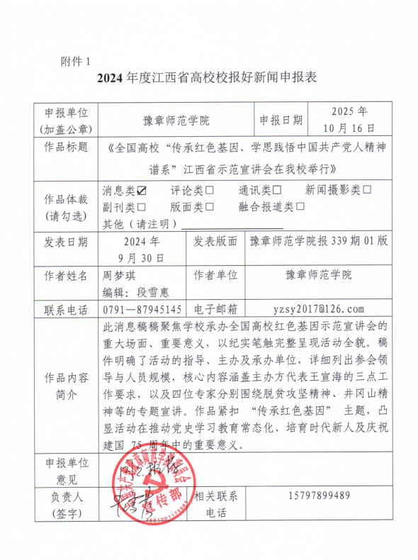 此消息稿稿聚焦学校承办全国高校红色基因示范宣讲会的重大场面、重要意义,以纪实笔触完整呈现活动全貌。稿件明确了活动的指导、主办及承办单位,详细列出参会领导与人员规模,核心内容涵盖主办方代表王宣海的三点工作要求,以及四位专家分别围绕脱贫攻坚精神、井冈山精神等的专题宣讲。作品紧扣 “传承红色基因” 主题,凸显活动在推动党史学习教育常态化、培育时代新人及庆祝建国 75 周年中的重要意义。