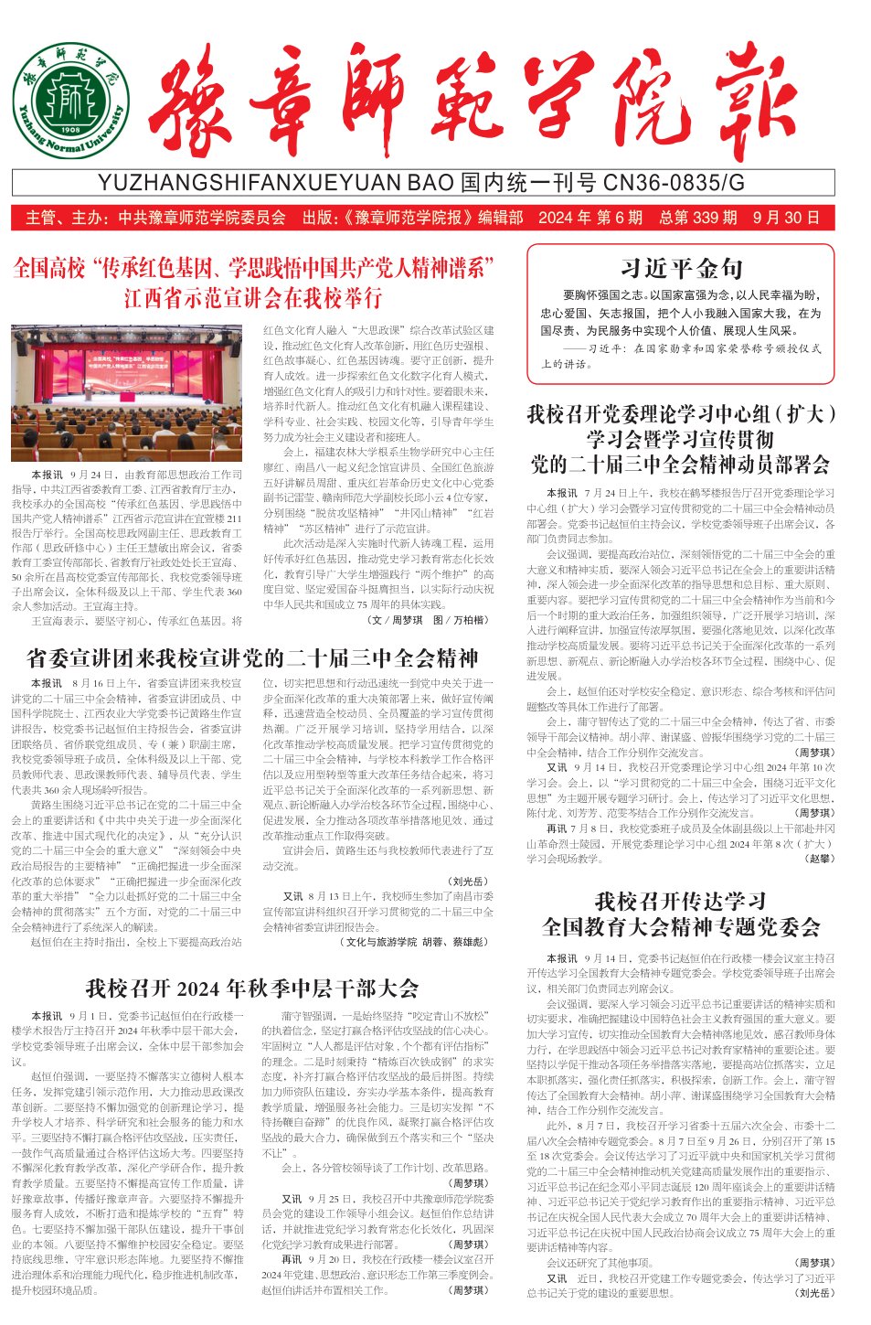 本报讯 9月24日,由教育部思想政治工作司指导,中共江西省委教育工委、江西省教育厅主办,我校承办的全国高校“传承红色基因、学思践悟中国共产党人精神谱系”江西省示范宣讲在宜萱楼211报告厅举行。全国高校思政网副主任、思政教育工作部(思政研修中心)主任王慧敏出席会议,省委教育工委宣传部部长、省教育厅社政处处长王宣海、50余所在昌高校党委宣传部部长、我校党委领导班子出席会议,全体科级及以上干部、学生代表360余人参加活动。王宣海主持。
