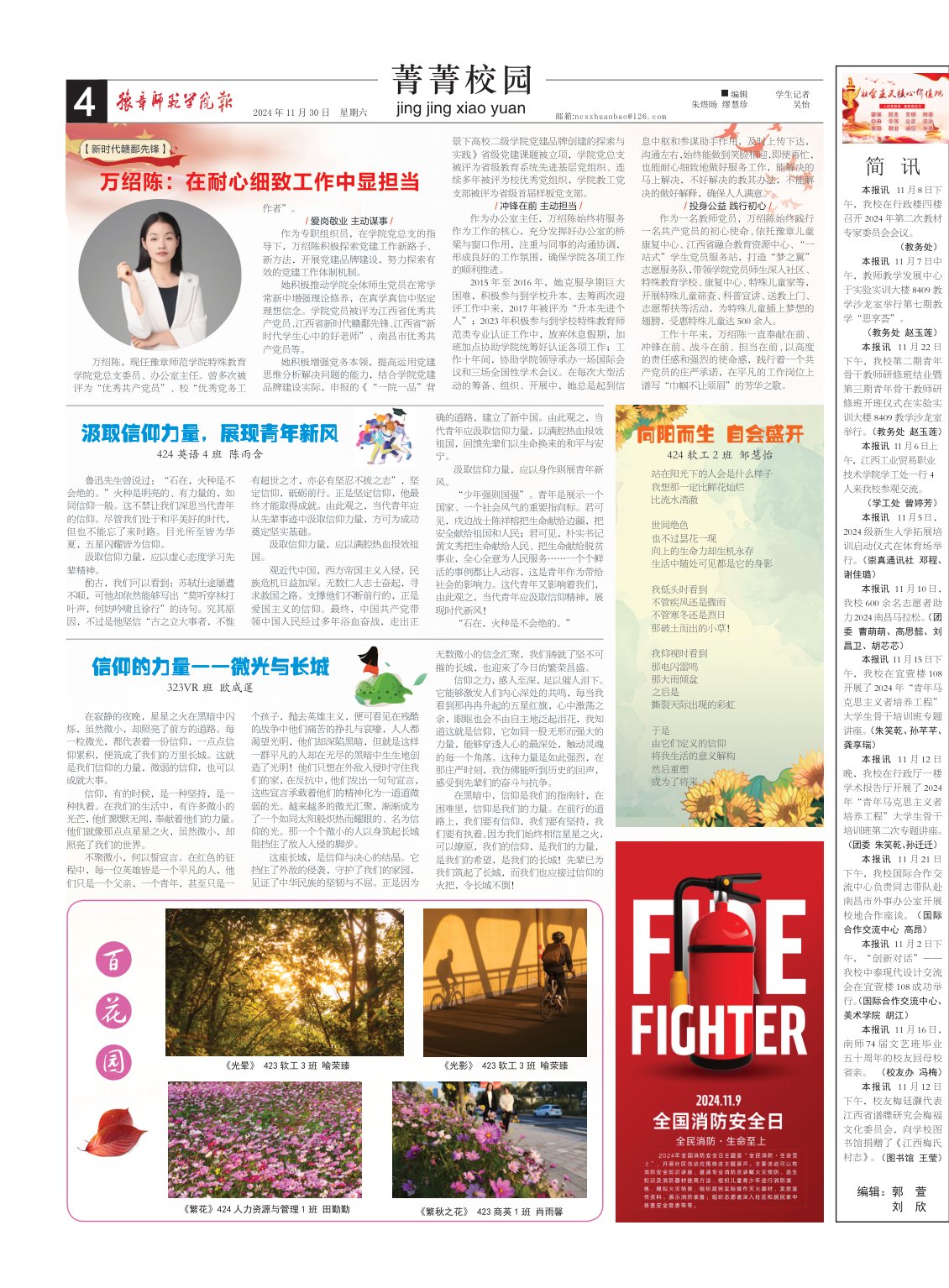 她积极推动学院全体师生党员在常学常新中增强理论修养,在真学真信中坚定理想信念。学院党员被评为江西省优秀共产党员、江西省新时代赣鄱先锋、江西省“新时代学生心中的好老师”、南昌市优秀共产党员等。