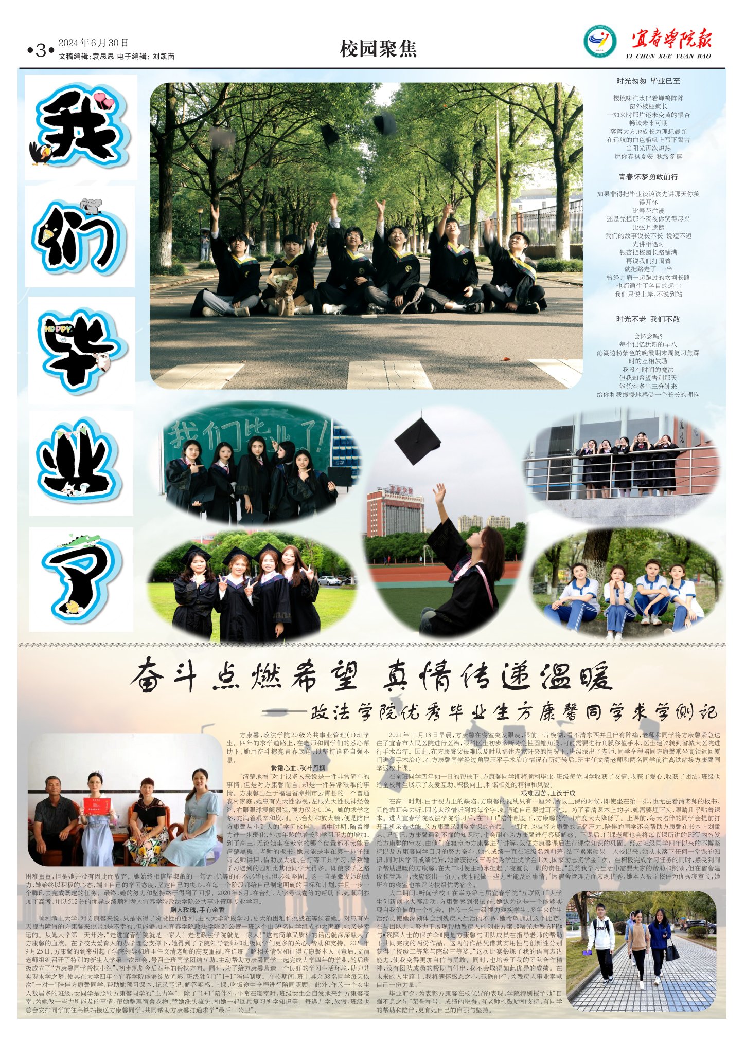 《宜春学院报》毕业季主题版面以“我们毕业啦”为核心主题:通过图文结合展现毕业生风采。内容上,头条为法学院优秀毕业生方康馨的求学侧记《奋斗点燃希望 真情传递温暖》,辅以“时光物语·毕业记”专栏,涵盖教师寄语、毕业季活动纪实等。版面特色鲜明:左侧竖排艺术字“我们毕业啦”醒目,中央大图呈现毕业生抛帽欢呼场景,下方配以多幅圆形、方形毕业合影,营造青春氛围。社会影响方面,既定格校园记忆、传递师生温情,又通过优秀学子案例激励在校生,成为连接校园与社会的情感纽带,彰显高校育人成果与人文关怀