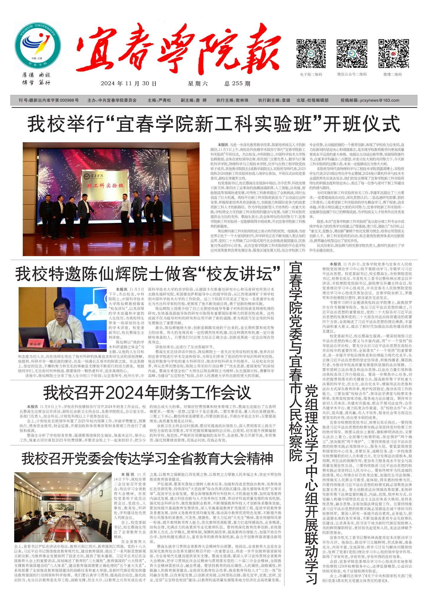 本报讯 为进一步深化教育教学改革,探索培养拔尖人才的新路径,11月5日上午,我校在科技楼学术报告厅举行“宜春学院新工科实验班”开班仪式。杰出校友、中科院院士、中国科学技术大学陈仙辉教授,全体在家校领导出席,相关部门主要负责人,数学与计算机科学学院、物理科学与工程技术学院、化学与生物工程学院党政班子成员,其他教学院院长(或教学副院长),实验班导师代表,2023级和2024级新工科实验班初选入闱学生参加。开班仪式由校党委委员、副校长李建军主持。