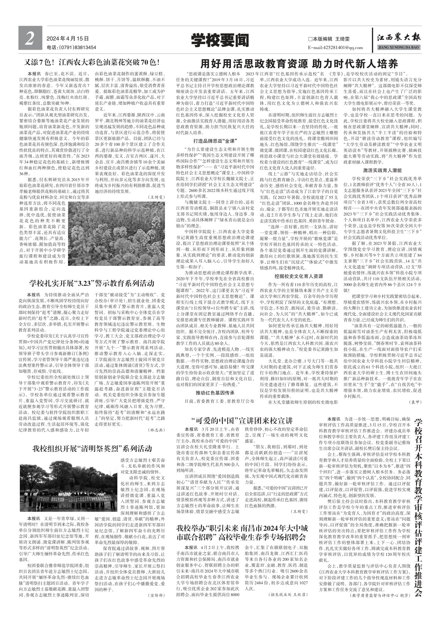 知名专家学者、先进模范人物、一线实践典型,一个个实例、一段段感悟、一组组数据、一件件实物,思想政治理论课蕴含的大道理,变得可感可知、通俗易懂!听完课的学生纷纷表示收获很大:“更加坚定了道路自信、理论自信、制度自信和文化自信,也对我们的国家更多了一份热爱。”日前,省委教育工委、省教育厅公布单,江西农业大学成功入选。近年来,江西农业大学坚持以习近平新时代中国特色社会主义思想为指导,实施红色基因传承工程,构建红色矩阵,丰富创新红色育人载体,用红色文化为立德树人和强农兴农铸魂。