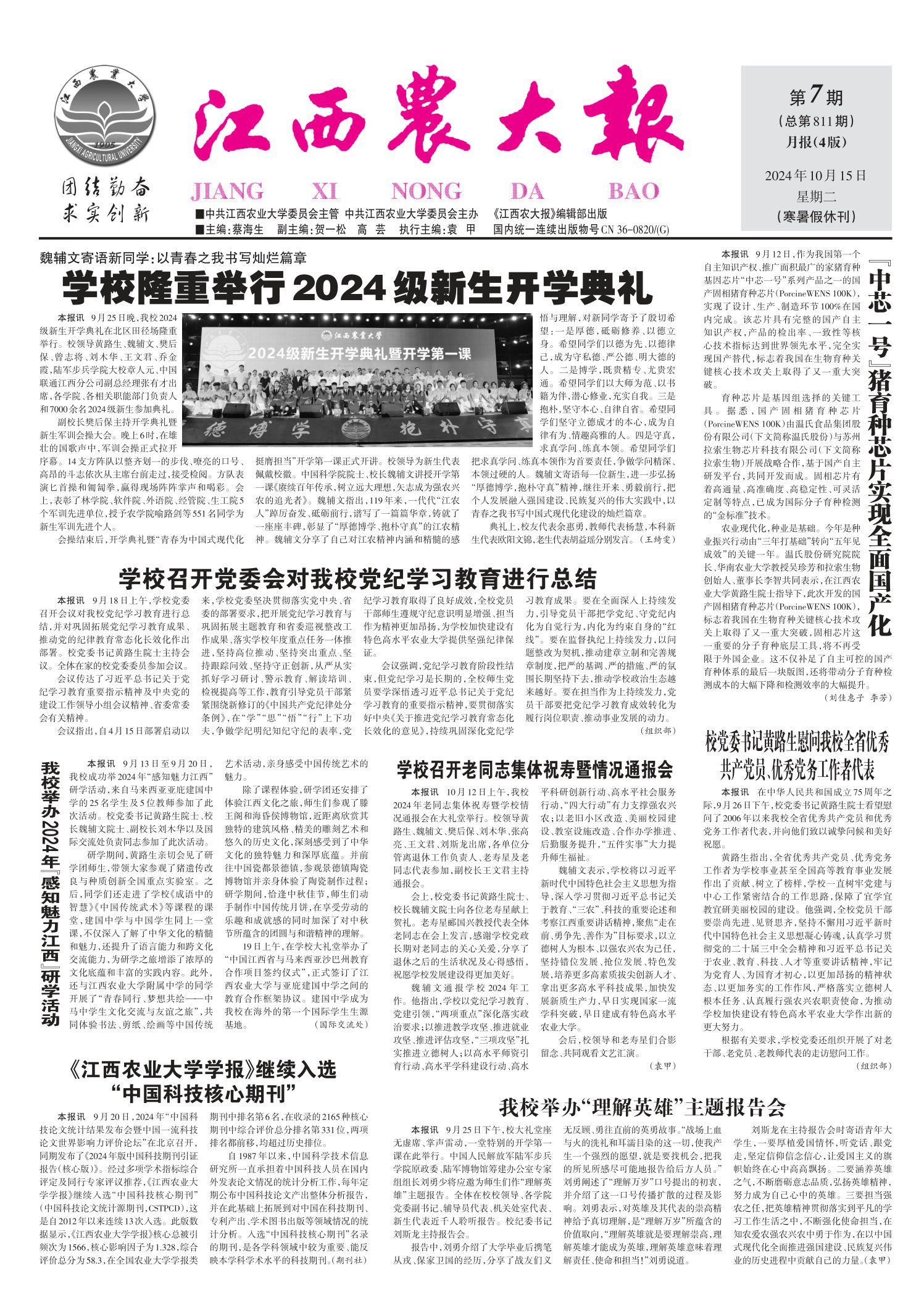 会操结束后,开学典礼暨“青春为中国式现代化挺膺担当”开学第一课正式开讲。校领导为新生代表佩戴校徽。中国科学院院士、校长魏辅文讲授开学第一课《赓续百年传承,树立远大理想,矢志成为强农兴农的追光者》。魏辅文指出,119年来,一代代“江农人”踔厉奋发、砥砺前行,谱写了一篇篇华章,铸就了一座座丰碑,彰显了“厚德博学、抱朴守真”的江农精神。魏辅文分享了自己对江农精神内涵和精髓的感悟与理解,对新同学寄予了殷切希望:一是厚德,砥砺修养、以德立身。希望同学们以德为先、以德律己,成为守私德、严公德、明大德的人。二是博学,既贵精专、尤贵宏通。希望同学们以大师为范、以书籍为伴,潜心修业,充实自我。三是抱朴,坚守本心、自律自省。希望同学们坚守立德成才的本心,成为自律有为、情趣高雅的人。四是守真,求真学问、练真本领。希望同学们把求真学问、练真本领作为首要责任,争做学问精深、本领过硬的人。魏辅文寄语每一位新生,进一步弘扬“厚德博学,抱朴守真”精神,继往开来、勇毅前行,把个人发展融入强国建设、民族复兴的伟大实践中,以青春之我书写中国式现代化建设的灿烂篇章。