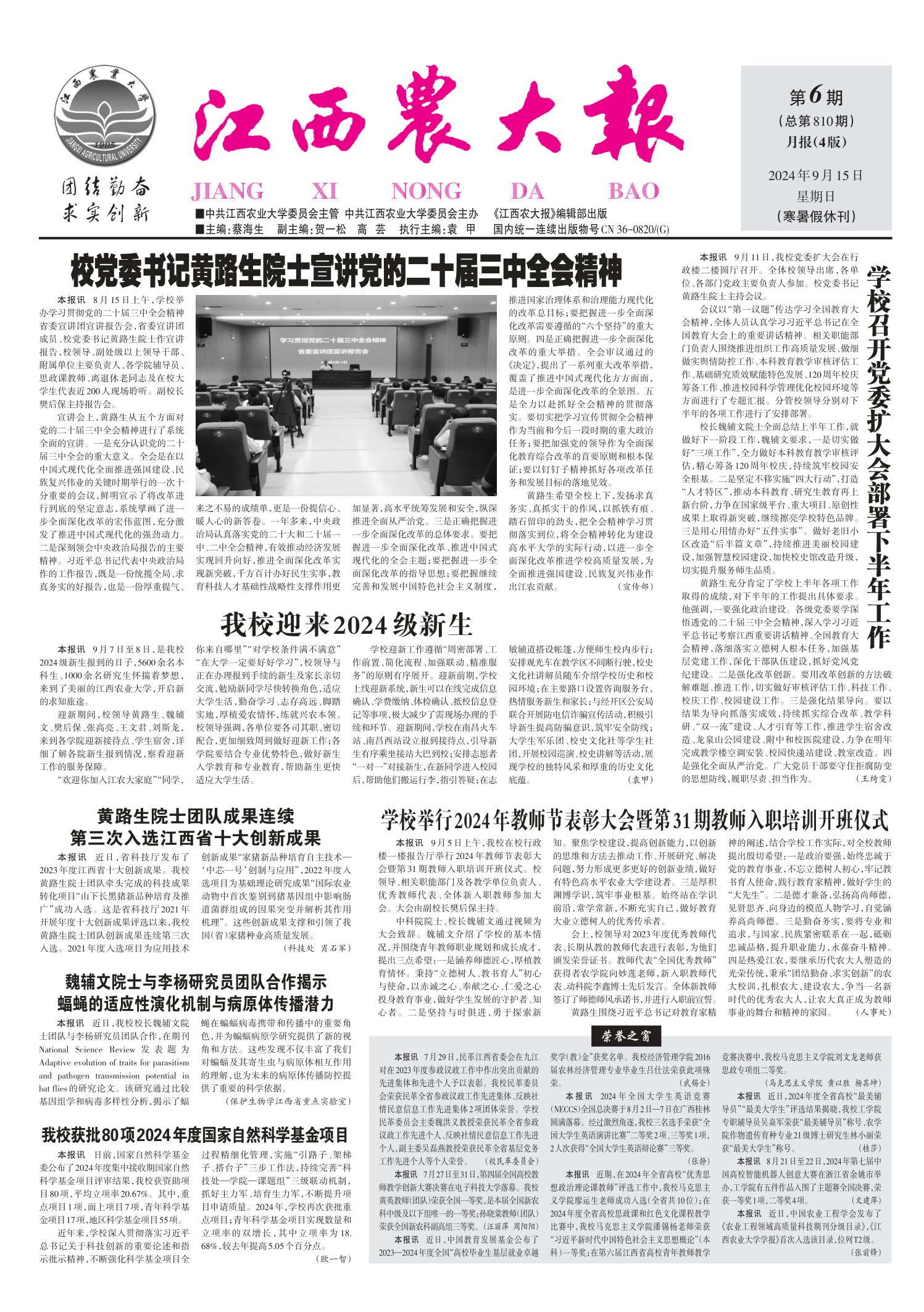 8 月 15 日上午,学校举办学习贯彻党的二十届三中全会精神省委宣讲团宣讲报告会,省委宣讲团成员、校党委书记黄路生院士作宣讲报告,校领导、副处级以上领导干部、附属单位主要负责人、各学院辅导员、思政课教师、离退休老同志及在校大学生代表近 200 人现场聆听。副校长樊后保主持报告会。