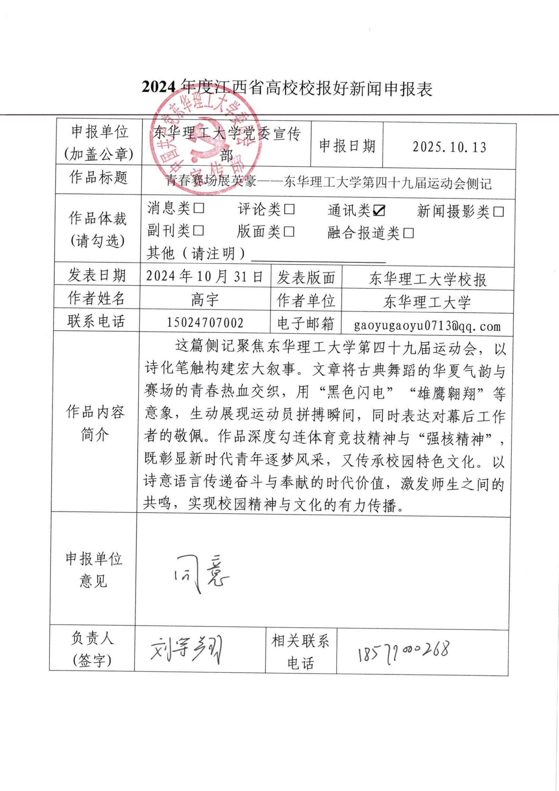 且以青春赴山海,青舟无惧万重山。我们站在青春的起跑线上,怀揣着梦想与希望。而体育精神赋予了我们勇气、智慧和力量,让我们在成长的征程中坚定信念,勇往直前。运动会虽已结束,但那不灭的火焰,将永远燃烧在每一个东华理工学子的心中,激励着他们继续发扬强核精神,追求卓越,勇攀高峰!