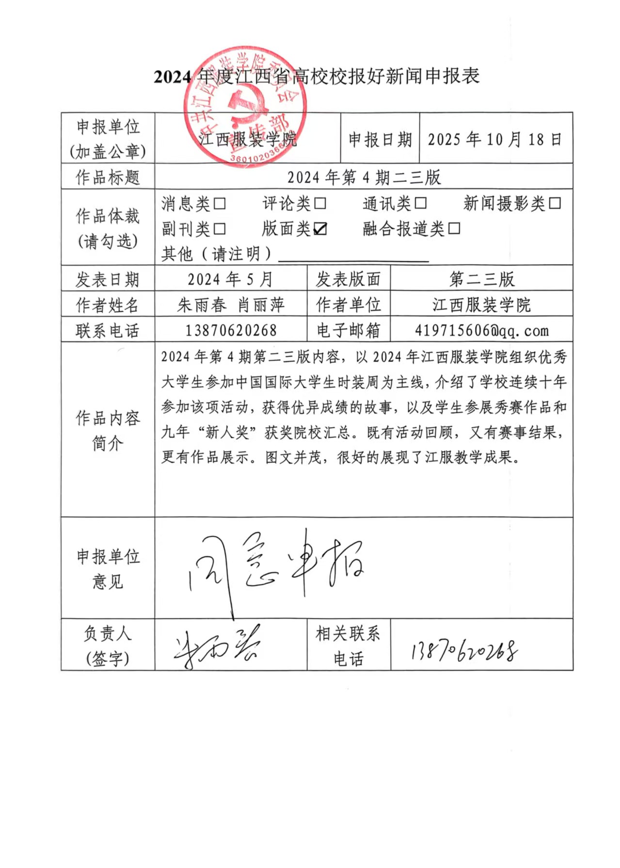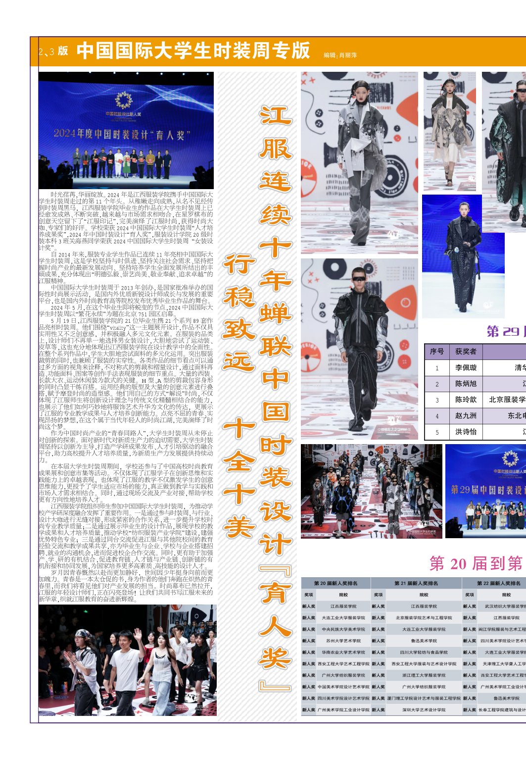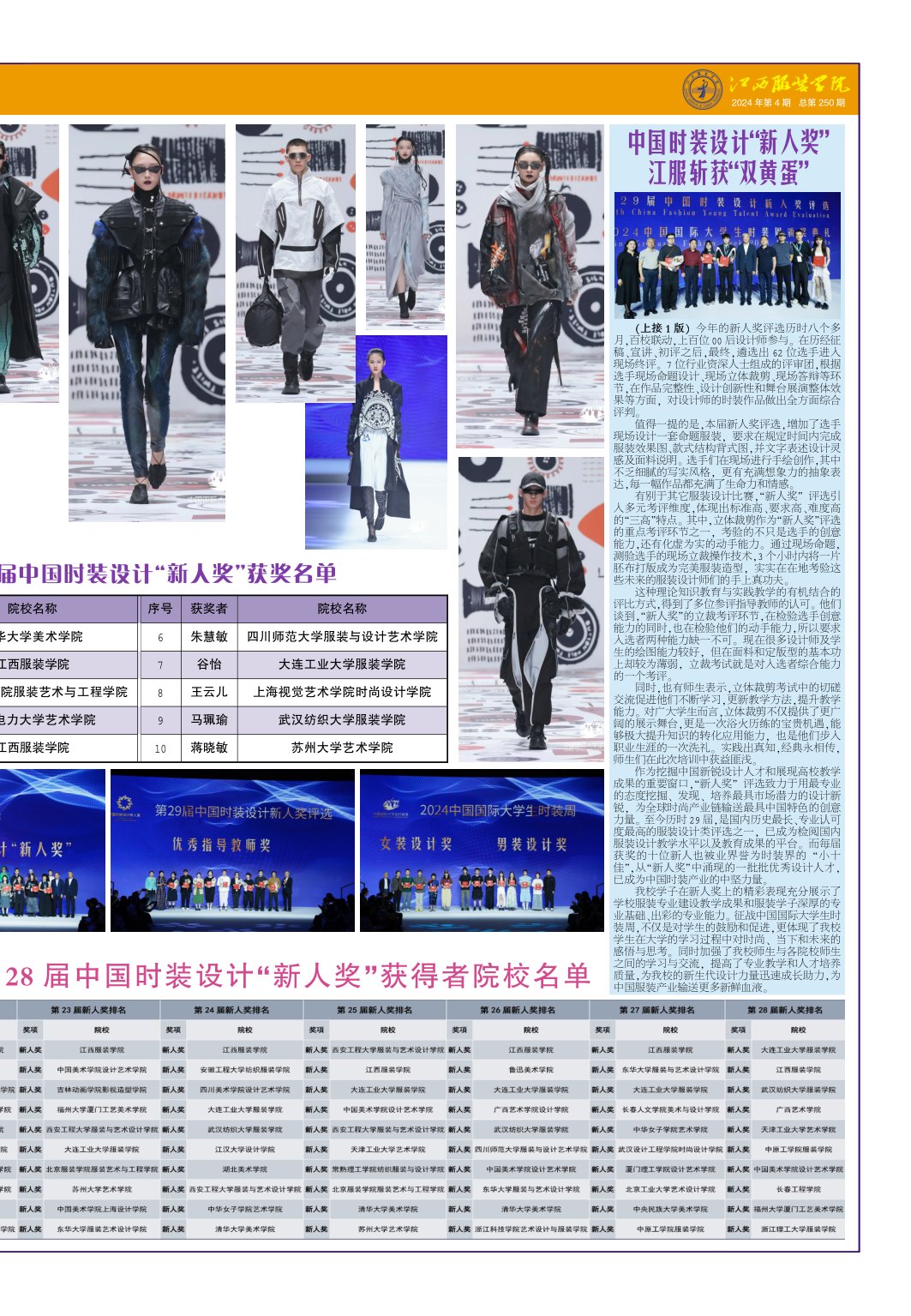2024年第4期第二三版内容,以2024年江西服装学院组织优秀 大学生参加中国国际大学生时装周为主线,介绍了学校连续十年 参加该项活动,获得优异成绩的故事,以及学生参展秀赛作品和 九年“新人奖”获奖院校汇总。既有活动回顾,又有赛事结果, 更有作品展示。图文并茂,很好的展现了江服教学成果。