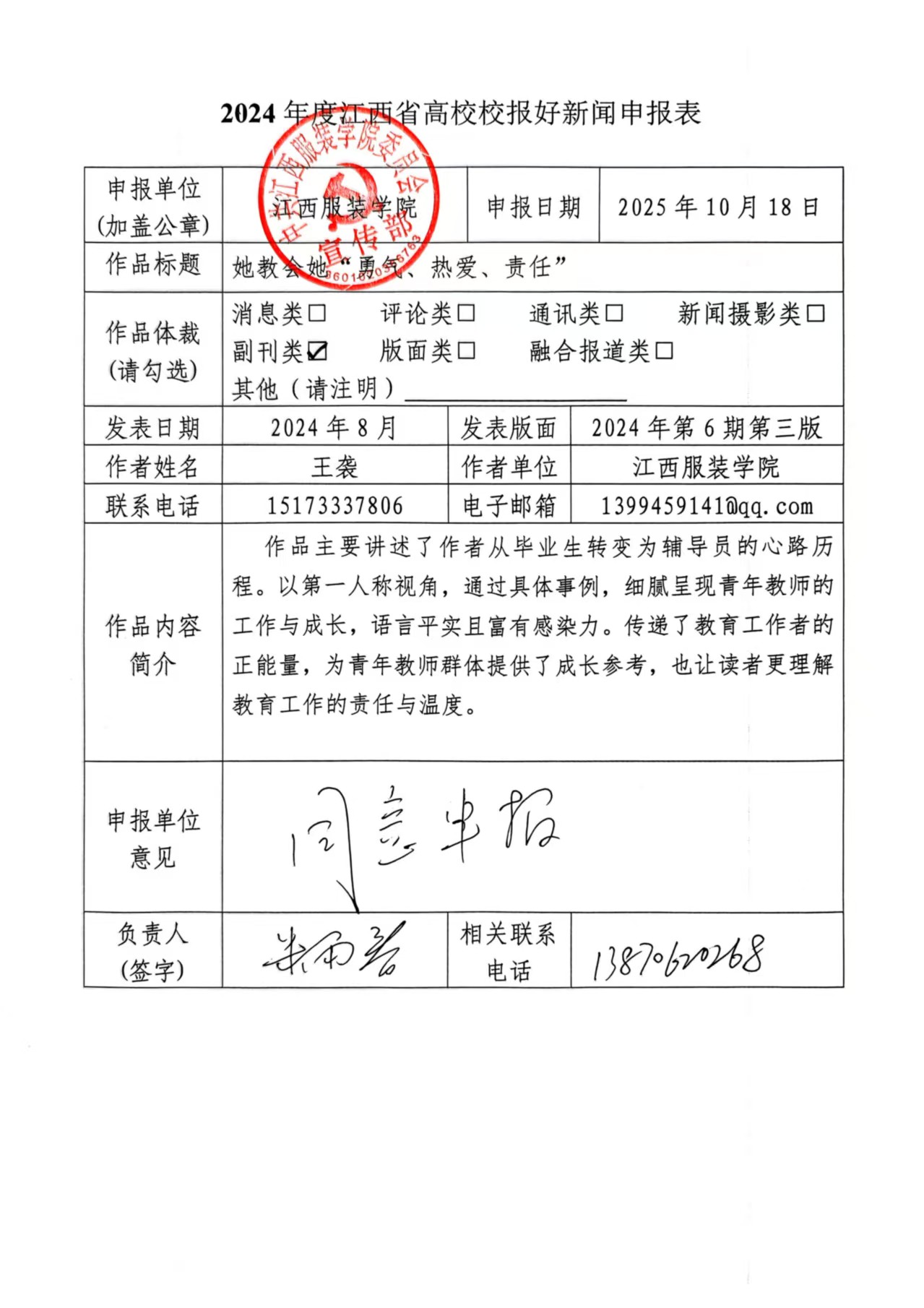 “来时的勇气”2022 年刚毕业的那个夏天,完成了硕士学习的她面临着就业方向的选择。 大学所在地的企业、事业编都已通过,但又恰逢故乡南昌的一所高校也传来了好消息。所以,她追寻了曾经的梦想,成为一名大学老师。 同年 9 月,她正式成为了江西服装学院的一名辅导员。 荣幸,也幸运。