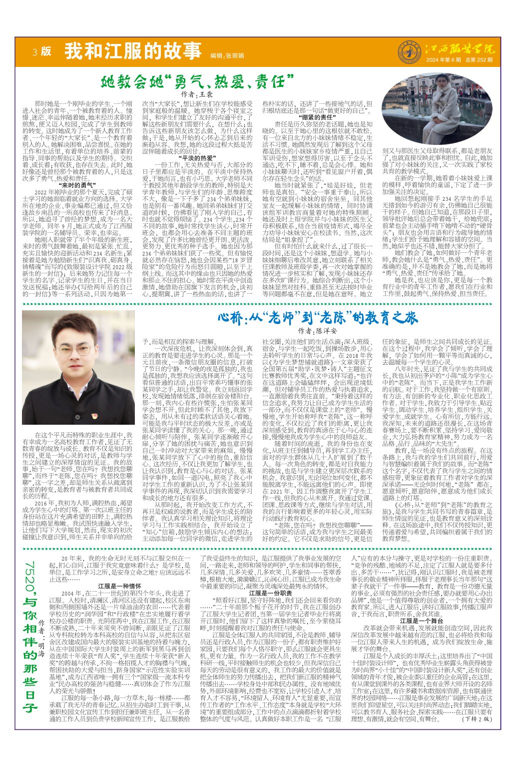 她回想起刚接手 234 名学生的手足无措到如今的游刃有余,仿佛她自己很能干的样子。 但她自己知道,在那段日子里,领导批评她后总会带着她干, 给她兜底;前辈也会主动插手啃下她啃不动的“硬骨头”; 朋友也会用言语和行为疏导她的情绪;学生们给予她理解和容错的空间。 当然,她似乎也还不错,能替大家分担了。