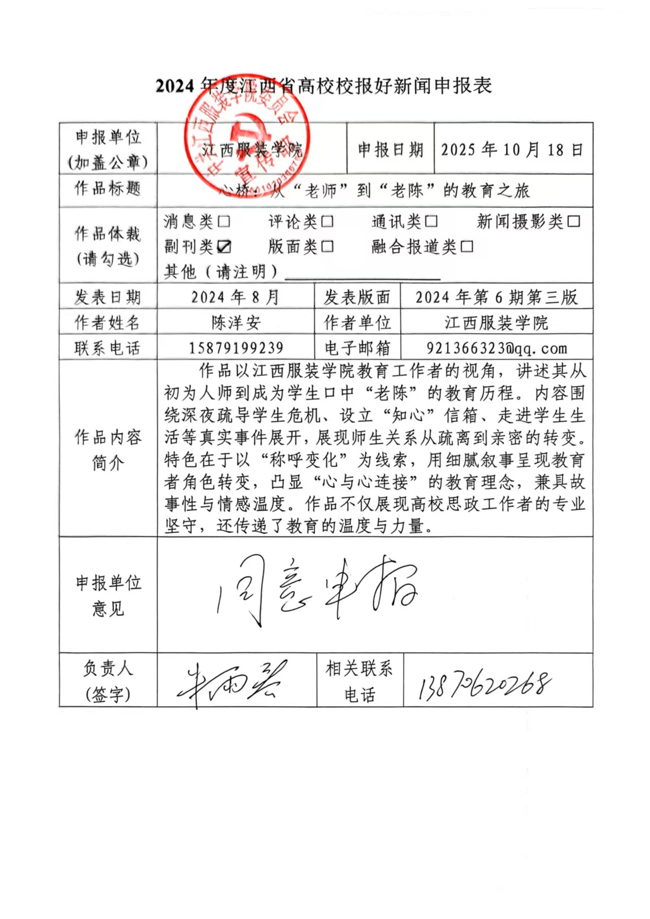 从那时起, 我开始改变工作方式,不再只是权威的说教者,而是学生成长的陪伴者。 我认真学习相关理论知识,将理论学习与工作实践相结合, 我开始设立了“知心”信箱,鼓励学生倾诉内心的想法;主动添加每一位同学的微信,走进学生的社交圈,关注他们的生活点滴;深入班级、宿舍,与学生一起吃饭,到操场散步,用心去聆听学生的日常与心声。 在 2018 年我以《为学生梦想铺就道路》一文章荣获了全国第五届“助学·筑梦·铸人”主题征文比赛教师优秀奖,在文中这样写道:“也许在这道路上会磕磕绊绊, 会出现逆境低潮, 但对辅导员工作的热爱与执着追求,一直激励着我勇往直前。 ”秉持着这样的信念追求,我努力让自己成为学生生活的一部分,而不仅仅是课堂上的“老师”。 慢慢地,学生开始称呼我“老陈”,这一称呼的变化,不仅拉近了我们的距离,更让我深刻感受到,教育的真谛在于心与心的连接,慢慢地我成为学生心中的良师益友。
