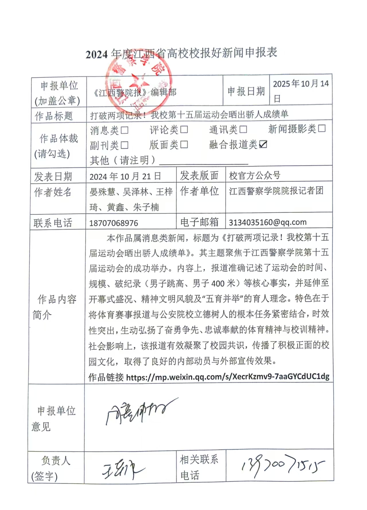 本作品标题为《打破两项记录!我校第十五届运动会晒出骄人成绩单》。其主题聚焦于江西警察学院第十五届运动会的成功举办。内容上,报道准确记述了运动会的时间、规模、破纪录(男子跳高、男子400米)等核心事实,并延伸至开幕式盛况、精神文明风貌及“五育并举”的育人理念。特色在于将体育赛事报道与公安院校立德树人的根本任务紧密结合,时效性突出,生动弘扬了奋勇争先、忠诚奉献的体育精神与校训精神。社会影响上,该报道有效凝聚了校园共识,传播了积极正面的校园文化,取得了良好的内部动员与外部宣传效果。 https://mp.weixin.qq.com/s/XecrKzmv9-7aaGYCdUC1dg