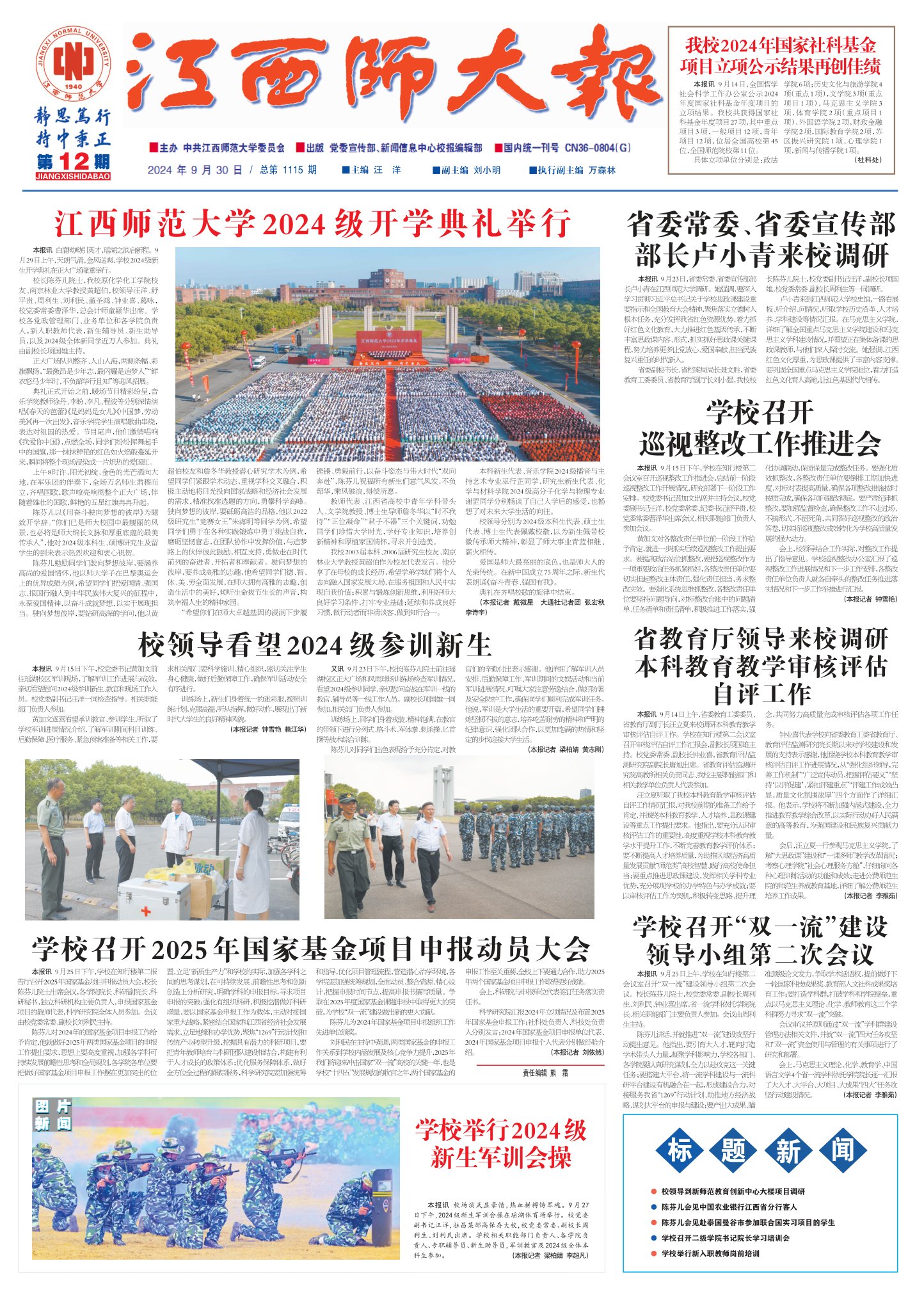 本报讯 校场演武显豪情,热血拼搏铸军魂。9月27日下午,2024级新生军训会操在瑶湖体育场举行。校党委副书记汪洋,驻昌某部高保存大校,校党委常委、副校长周利生、刘利民出席。学校相关职能部门负责人、各学院负责人、专职辅导员、新生助导员,军训教官及2024级全体本科生参加。