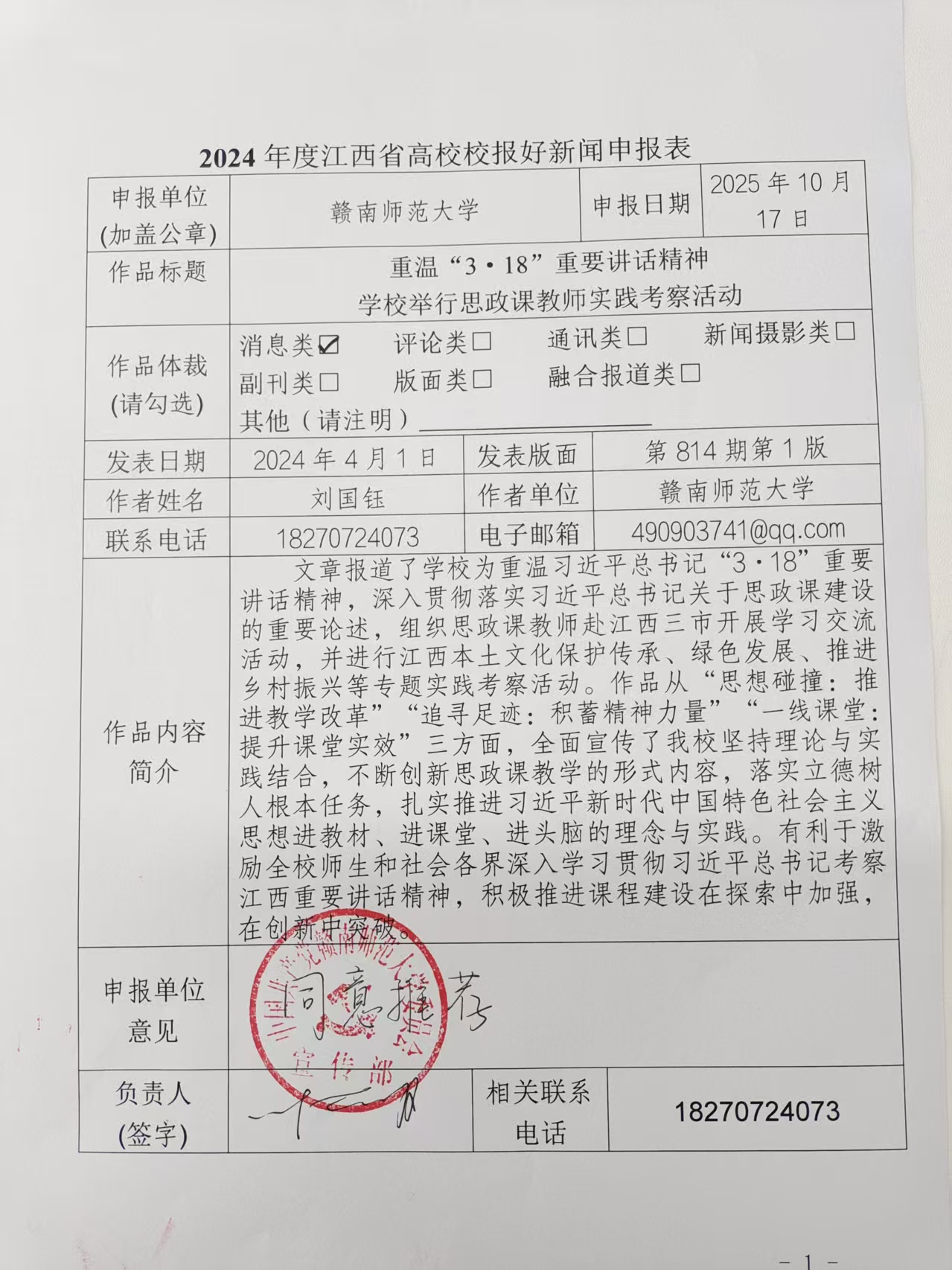 【本报讯】(刘国钰)为重温习近平总书记“3·18”重要讲话精神,深入贯彻落实习近平总书记关于思政课建设的重要讲话、指示批示精神,学习贯彻习近平总书记考察江西重要讲话精神,追寻习近平总书记足迹,学校于 2024 年 3月 15 至 3 月 17 日组织思政课教师赴九江、景德镇、上饶开展学习交流活动,并进行江西本土文化保护传承、绿色发展、推进乡村振兴等专题实践考察活动。