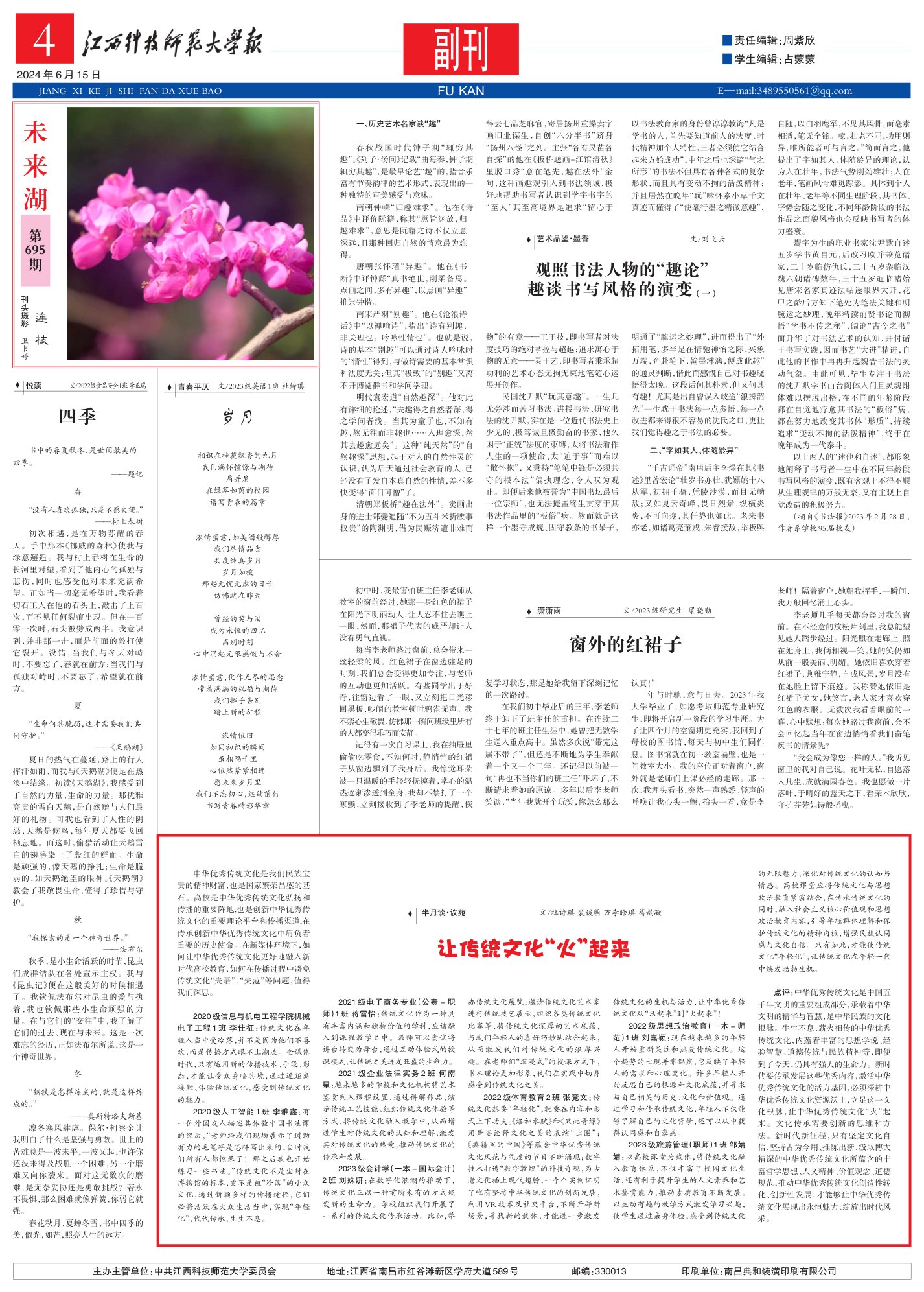 2021级企业法律实务2班何南星:越来越多的学校和文化机构将艺术鉴赏列入课程设置,通过讲解作品、演示传统工艺技能、组织传统文化体验等方式,将传统文化融入教学中,从而增进学生对传统文化的认知和理解,激发其对传统文化的热爱,推动传统文化的传承和发展。