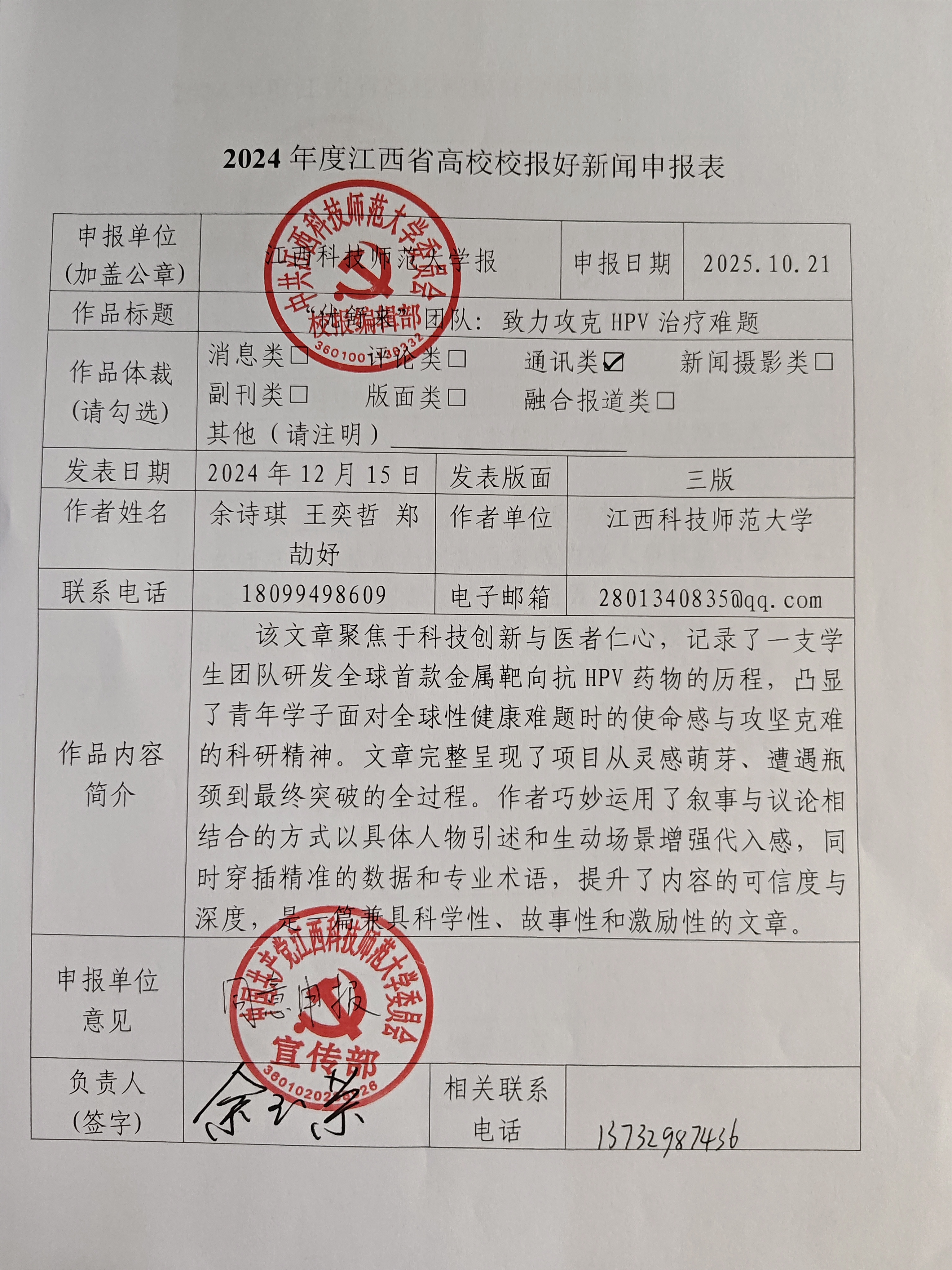 “团队的实验方向来自抗幽门螺旋杆菌的金属靶向药物。研发过程中,金属药物枸橼酸铋能够抑制新冠病毒的发现给我们带来了新的灵感。既然金属靶向药物可以作用于抑制新冠病毒,那也可能作用于抗击HPV病毒。”由此,汪雪蓉、孙雅娟、徐宇轩等同学组建了“优舒来”团队,确定了“为HPV治疗难题的解决提供中国方案”的目标。