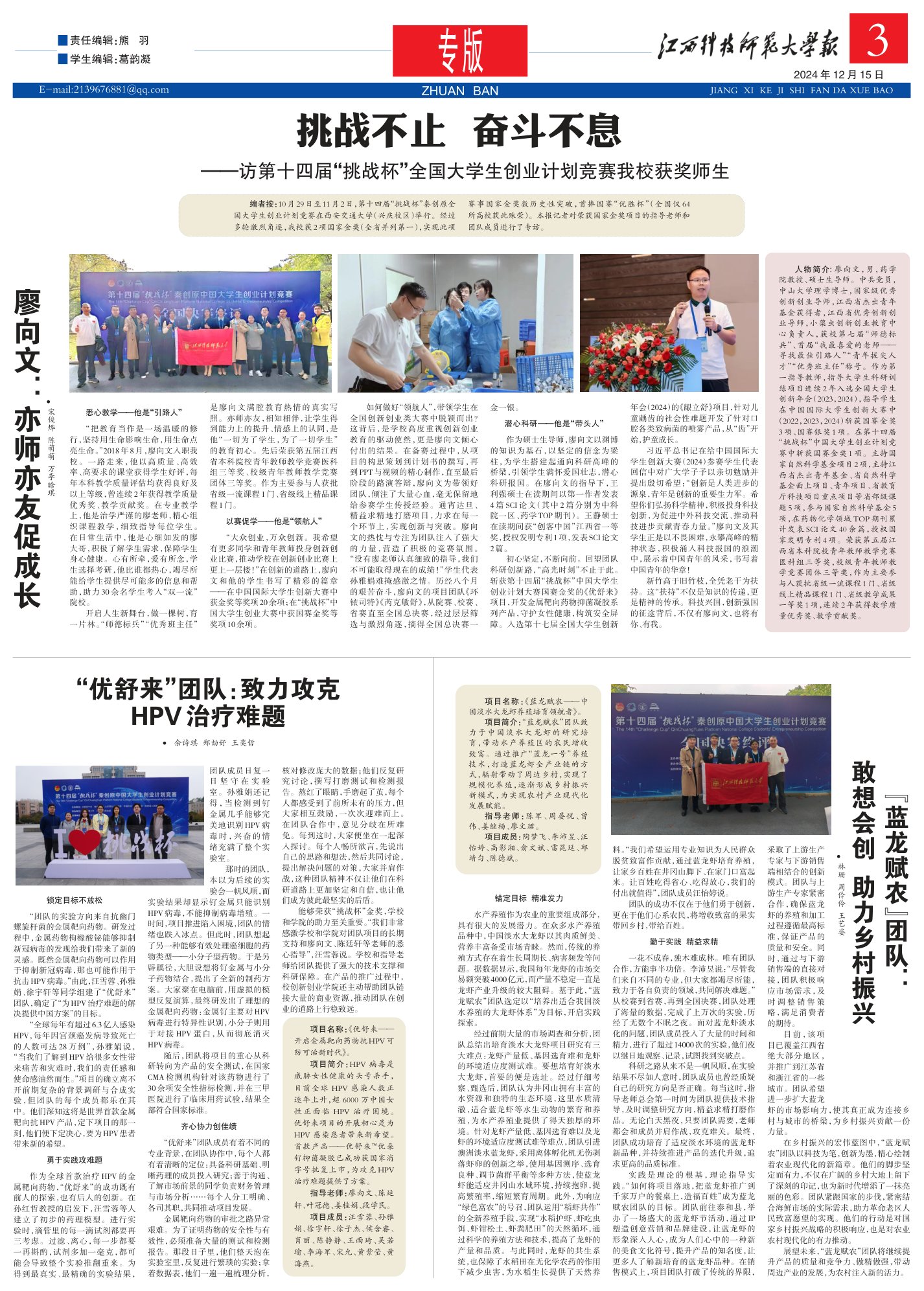 能够荣获“挑战杯”金奖,学校和学院的助力至关重要。“我们非常感激学校和学院对团队项目的长期支持和廖向文、陈廷轩等老师的悉心指导”,汪雪蓉说。学校和指导老师给团队提供了强大的技术支撑和科研保障。在产品的推广过程中,校创新创业学院还主动帮助团队链接大量的商业资源,推动团队在创业的道路上行稳致远。项目名称: