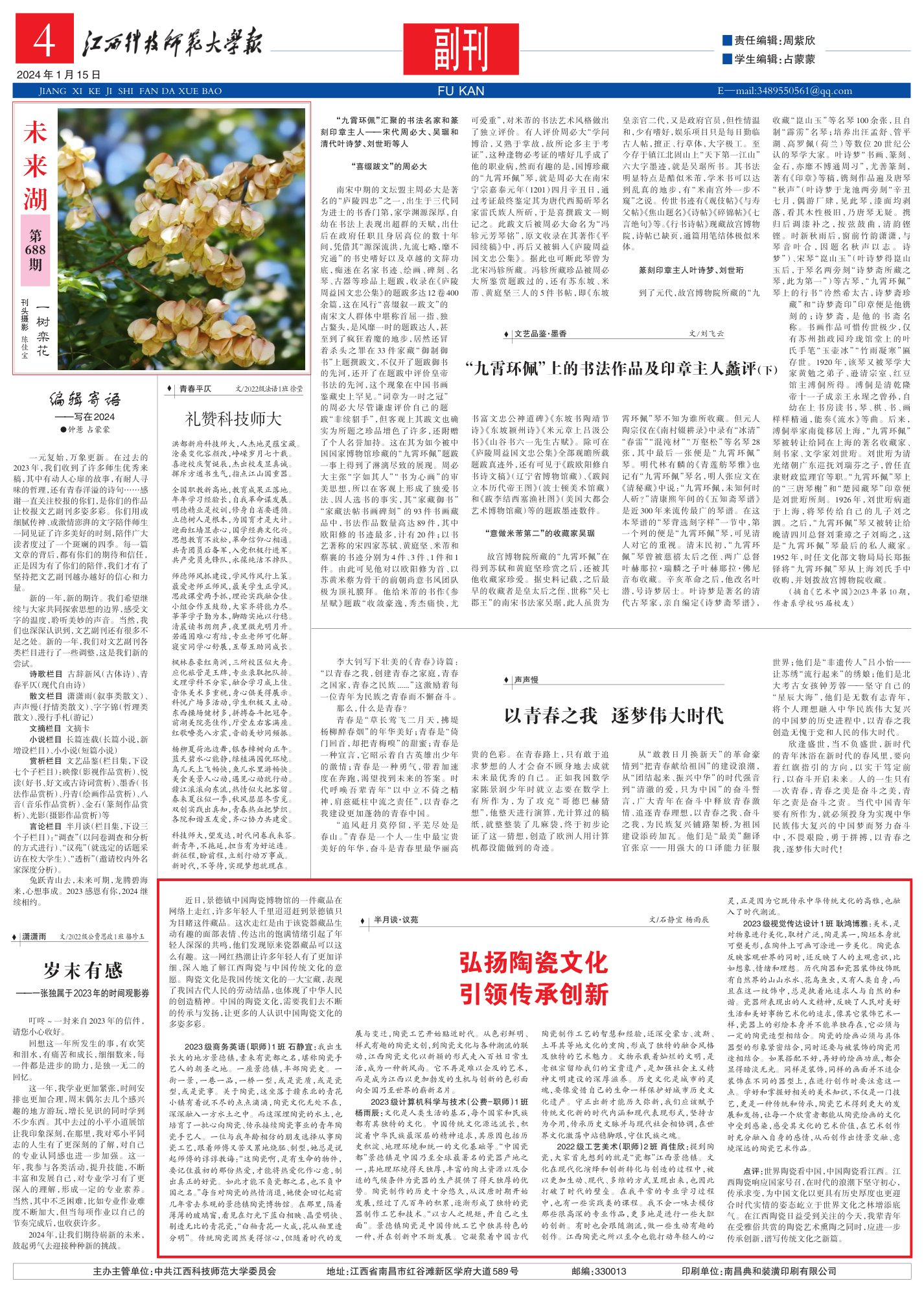 以七言组诗的形式,热情讴歌江西科技师范大学的 办学历程与育人成就。作品从“沧桑变化容颜改”的校 史追溯切入,通过“师德师风抓建设”“思政课堂两手 抓”等具体场景,立体展现学校在职业教育、思政建设、 学风培育等方面的扎实成果。全篇将传统诗词形式与现 代教育主题相融合,通过明快韵律与鲜活动象,生动传 递了“明德精业”的校训精神,既是对高校育人成果的 诗意记录,也是对职业教育发展的热情礼赞。 洪都新府科技师大,人杰地灵蕴宝藏。沧桑变化容颜改,峥嵘岁月七十载。喜迎校庆贺诞辰,杰出校友显真诚。挥斥方遒书生气,指点江山国重器。全国职教新高地,教育成果正落地。年年学习经验长,自我革命谋发展。明德精业是校训,修身自省要遵循。立德树人是根本,为国育才是大计。迎面红墙显赤心,国学经典文化兴。思想教育不放松,革命信仰心相通。共青团员后备军,入党积极行进军。共产党员先锋队,永葆纯洁不掉队。师德师风抓建设,学风作风行上策。最爱老师正师风,最美学生正学风。思政课堂两手抓,理论实践融合佳。小组合作互鼓劲,大家齐将能力尽。莘莘学子勤为本,脚踏实地以行稳。清晨读书朗朗声,夜里微光明月升。若遇困难心有结,专业老师可化解。寝室同学心舒展,互帮互助同成长。枫林泰豪红角洲,三所校区似大舟。应化旅管是王牌,专业录取把队排。文理学科不分家,融合学习成上佳。音体美术多重视,身心俱美得展示。科悦广场多活动,学生积极又主动。东西操场健材多,拼搏奋斗把冠夺。前湖美院亮佳作,厅堂左右客满座。红歌嘹亮八方震,音韵美妙同频振。杨柳夏荷池边舞,银杏樟树向正午。蓝天碧水心能静,绿植满园优环境。鸟儿天上飞畅快,鱼儿水里游畅快。美食美景人心动,遇见心动就行动。赣江滚滚向东流,热情似火把客留。春来夏往似一季,秋风瑟瑟冬雪觅。双创实践出真知,青春热血把梦织。各院和谐互友爱,齐心协力共建爱。科技师大,望发达,时代问卷我来答。新青年,不拖延,担当有为好运连。新征程,盼前程,立刻行动万事成。新时代,不等待,实现梦想就现在。