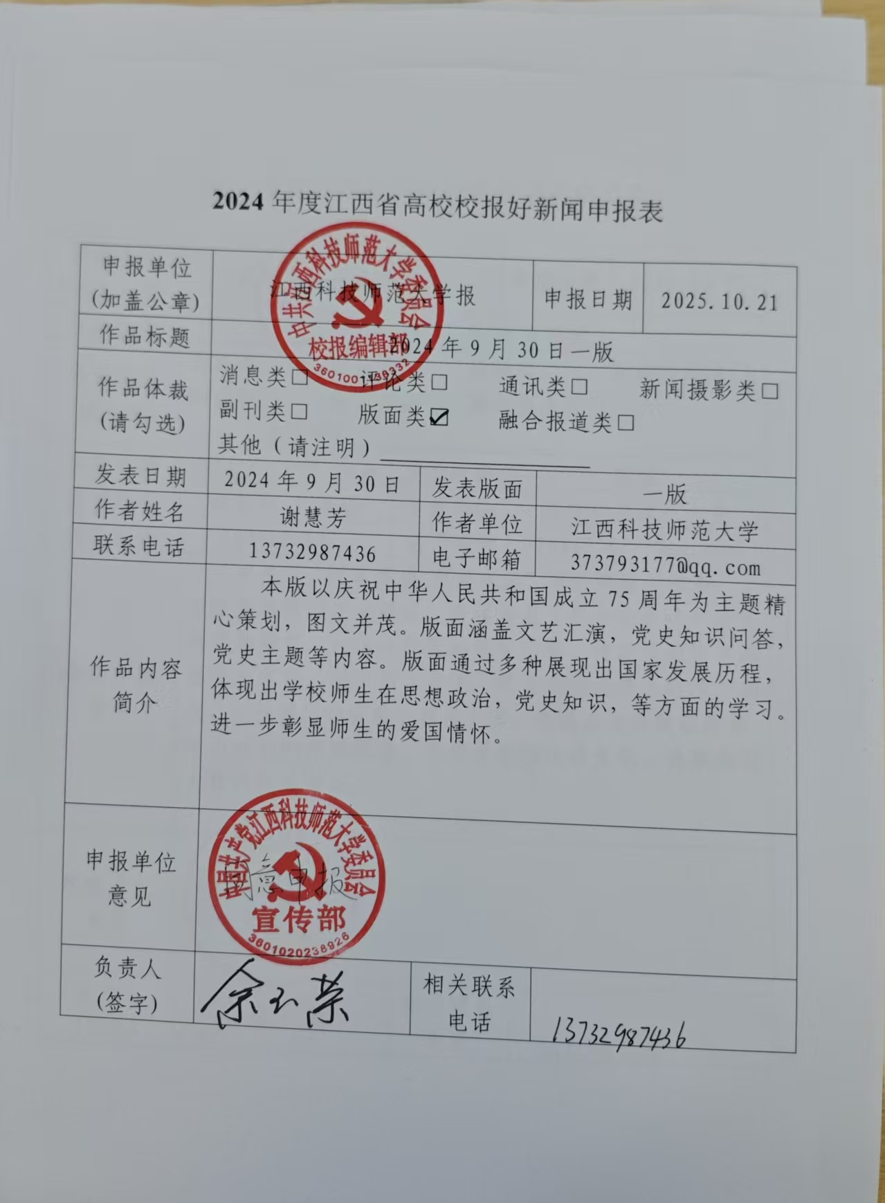 本版以庆祝中华人民共和国成立75周年为主题精 心策划,图文并茂。版面涵盖文艺汇演,党史知识问答, 党史主题等内容。版面通过多种展现出国家发展历程, 体现出学校师生在思想政治,党史知识,等方面的学习。 进一步彰显师生的爱国情怀。
