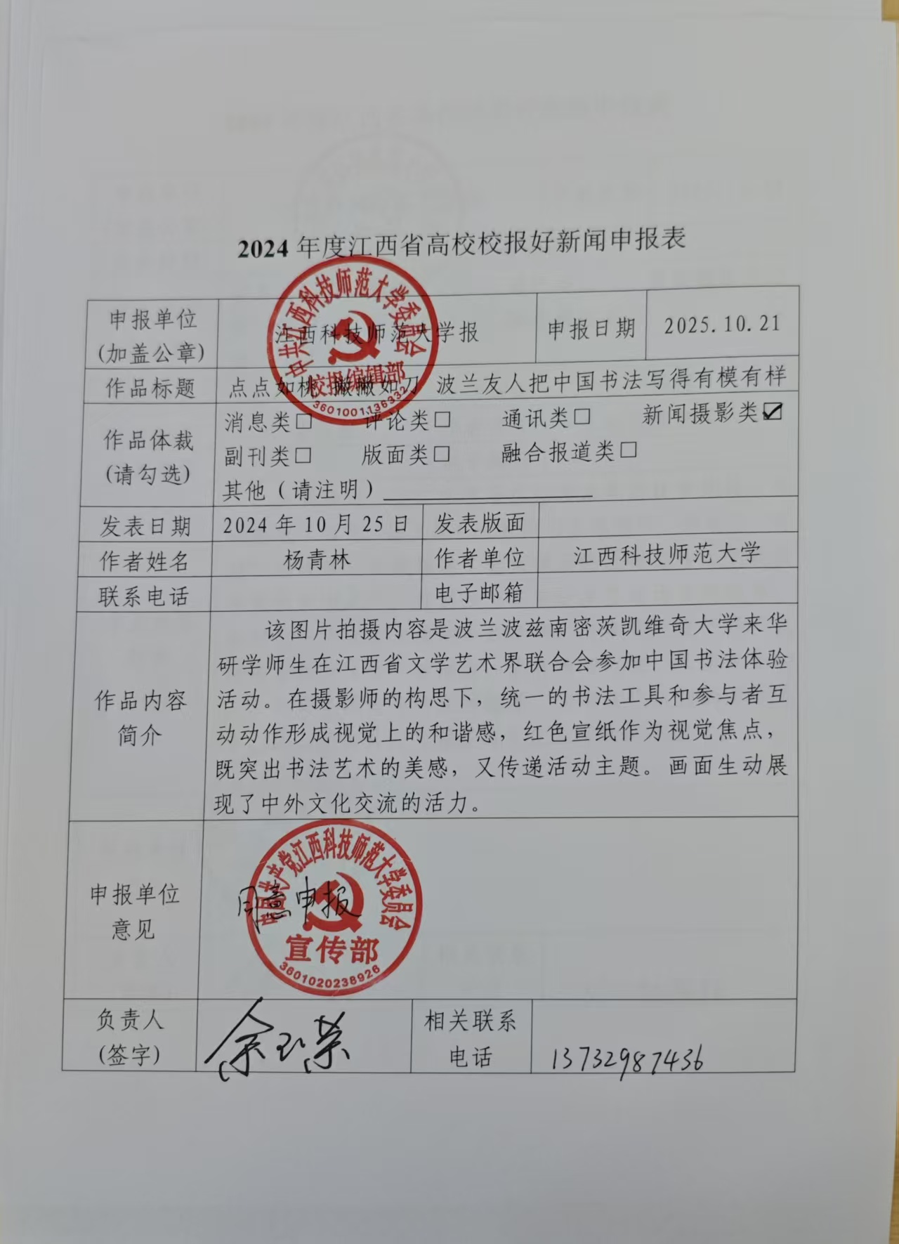 该图片拍摄内容是波兰波兹南密茨凯维奇大学来华 研学师生在江西省文学艺术界联合会参加中国书法体验 活动。在摄影师的构思下,统一的书法工具和参与者互 动动作形成视觉上的和谐感,红色宣纸作为视觉焦点, 既突出书法艺术的美感,又传递活动主题。画面生动展 现了中外文化交流的活力。