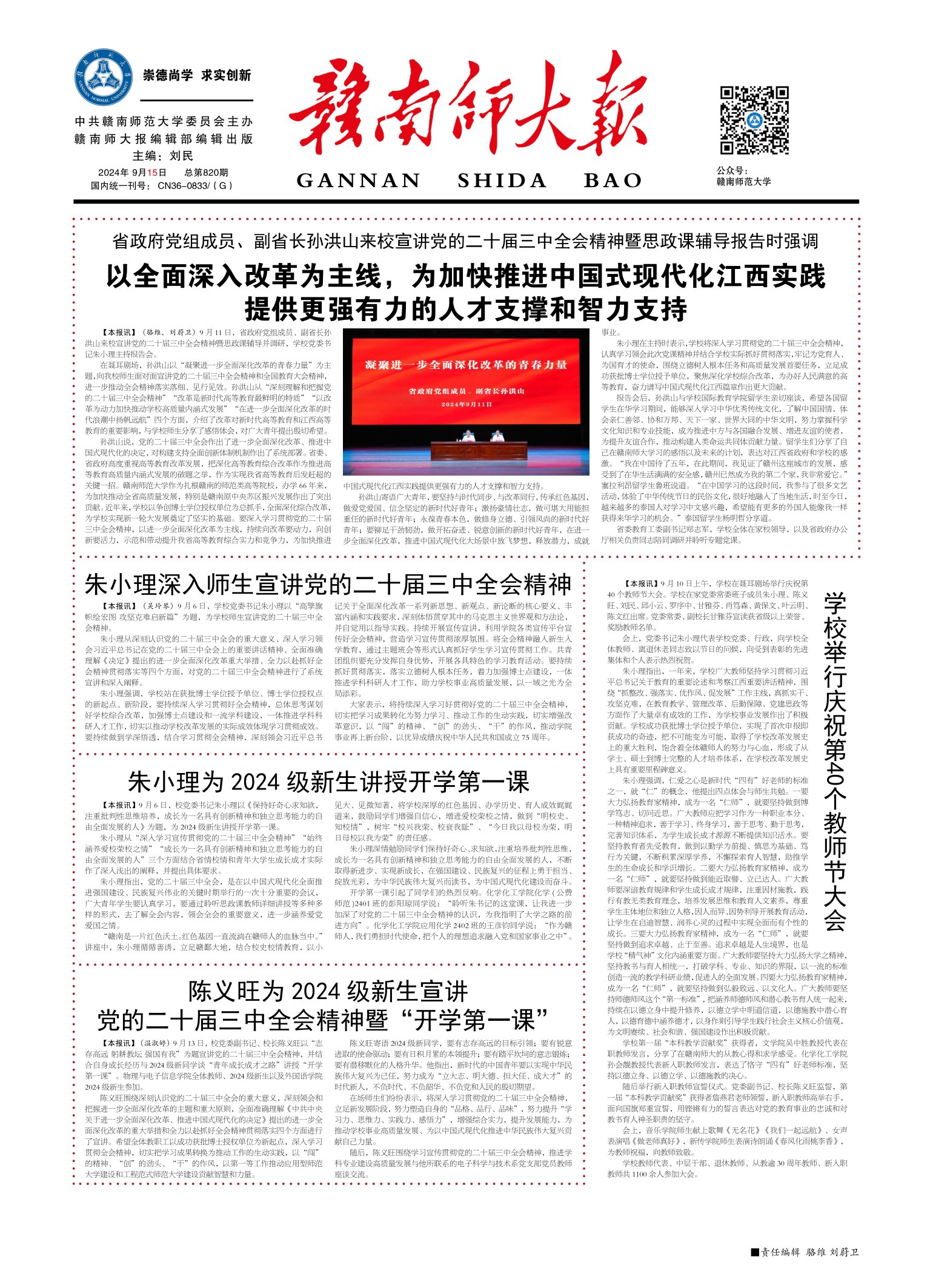 孙洪山说,党的二十届三中全会作出了进一步全面深化改革、推进中国式现代化的决定,对构建支持全面创新体制机制作出了系统部署。省委、省政府高度重视高等教育改革发展,把深化高等教育综合改革作为推进高等教育高质量内涵式发展的破题之举,作为实现我省高等教育后发赶超的关键一招。赣南师范大学作为扎根赣南的师范类高等院校,办学 66 年来,为加快推动全省高质量发展,特别是赣南原中央苏区振兴发展作出了突出贡献。近年来,学校以争创博士学位授权单位为总抓手,全面深化综合改革,为学校实现新一轮大发展奠定了坚实的基础。要深入学习贯彻党的二十届三中全会精神,以进一步全面深化改革为主线,持续向改革要动力,向创新要活力,示范和带动提升我省高等教育综合实力和竞争力,为加快推进中国式现代化江西实践提供更强有力的人才支撑和智力支持。