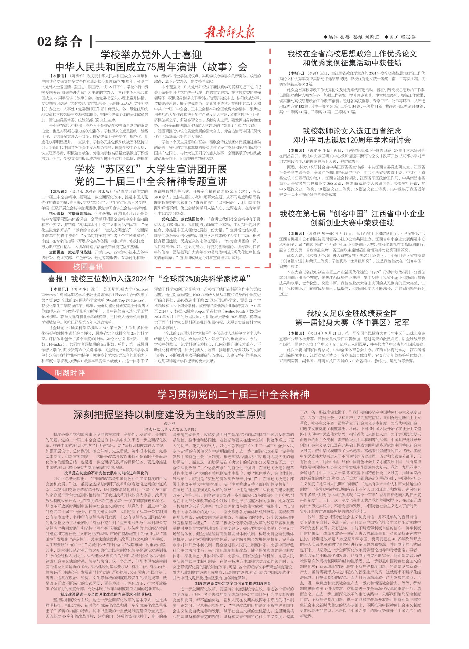 坚持以制度设为主线,是进一步全面深化改革的基本原则,也是其鲜明特征。相比过去,新时代全面深化改革和进一步全面深化改革呈现出了许多新的内涵和特点,其中很重要的一点就是制度建设分量更重。因为经过 40 多年的改革开放,好吃的肉、好喝的汤都吃掉了,剩下的都是难啃的硬骨头,改革更多面对的是深层次的体制机制问题以及改革的系统性、整体性和协同性,这就必然要求在建章立制、构建体系上下更大的功夫、花更多的气力。习近平总书记在《关于二十届三中全会 < 决定 > 起草的有关情况》中就明确指出,进一步全面深化改革是“完善和发展中国特色社会主义制度、推进国家治理体系和治理能力现代化的迫切需要”,而且这一迫切需要在《决定》的总论部分又是放在了进一步全面深化改革“六个必然要求”的首位进行强调;在阐述《决定》起草过程中须重点把握的有关原则要求中指出,要“抓住重点,突出体制机制改革”,特别是“突出经济体制改革牵引作用”;在阐述《决定》部署未来改革重大举措时指出,要“注重构建支持全面创新体制机制”;在阐述“注重加强党对改革的领导”中还是指出要“深化党的建设制度改革”,等等。可见,制度建设贯穿进一步全面深化改革的始终。而且《决定》也在不同部分和改革的各个领域中都进行了程度不同的强调。比如在第一板块总论部分论述新时代全面深化改革的伟大成就时就指出,“以习近平同志为核心的党中央 ...... 坚决破除各方面体质机制弊端,实现改革由局部探索、破冰突围到系统集成、全面深化的转变,各个领域基础性制度框架基本建立”;在第二板块分论部分阐述改革的战略部署和重要举措时更是非常鲜明地突出了制度建设,提出要构建高水平社会主义市场经济体制、健全推进经济高质量发展体制机制、构建支持全面创新体制机制、完善宏观调控制度体系、完善城乡融合发展体制机制、完善高水平对外开放体制机制、健全全过程人民民主制度体系、完善中国特色社会主义法治体系、深化文化体制机制改革、健全保障和改善民生制度体系、深化生态文明体制改革、完善维护国家安全体制机制、完善人民军队领导管理体制机制等。在第三板块论述加强党对改革的领导时,又突出强调深化党的建设制度改革。可见,各个领域的改革都聚焦制度建设,着力形成制度建设的系统集成,以制度建设的现代化助力中国式现代化,并为中国式现代化提供坚强有力的制度保障。