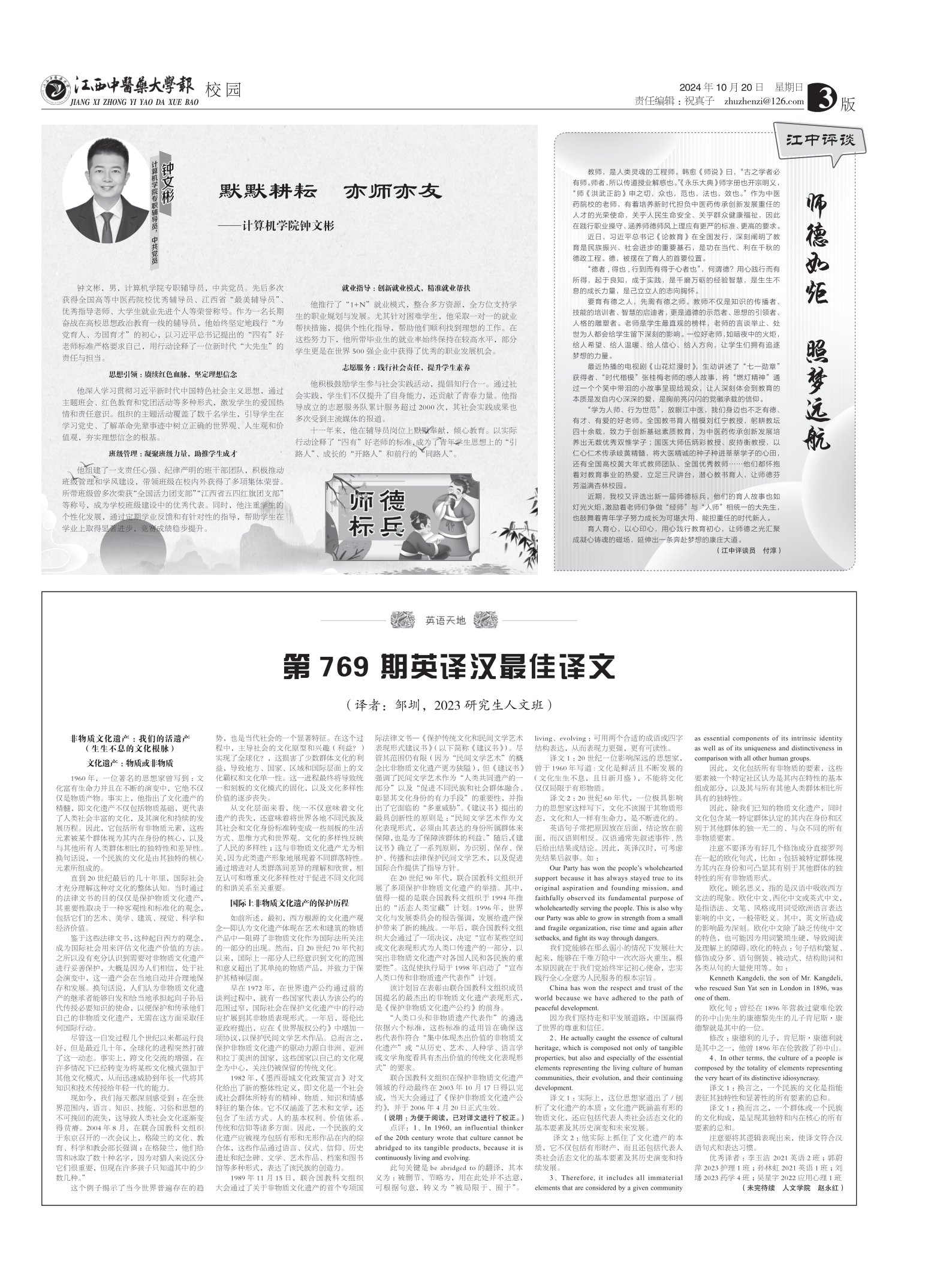 “学为人师、行为世范”,放眼江中医,我们身边也不乏有德、有才、有爱的好老师。全国教书育人楷模刘红宁教授,躬耕教坛四十余载,致力于创新基础素质教育,为中医药传承创新发展培养出无数优秀双惟学子 ;国医大师伍炳彩教授、皮持衡教授,以仁心仁术传承岐黄精髓,将大医精诚的种子种进莘莘学子的心田,还有全国高校黄大年式教师团队、全国优秀教师……他们都怀抱着对教育事业的热爱,立足三尺讲台,潜心教书育人,让师德芬芳溢满杏林校园。