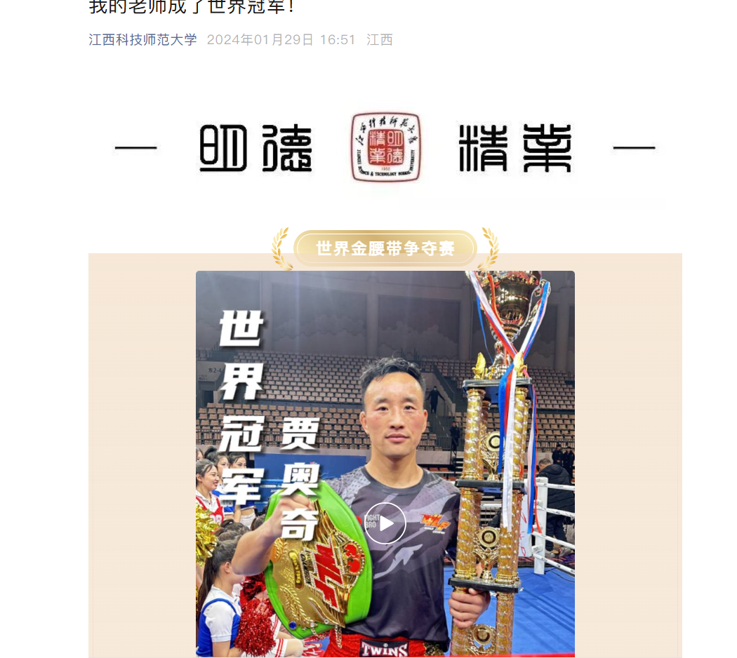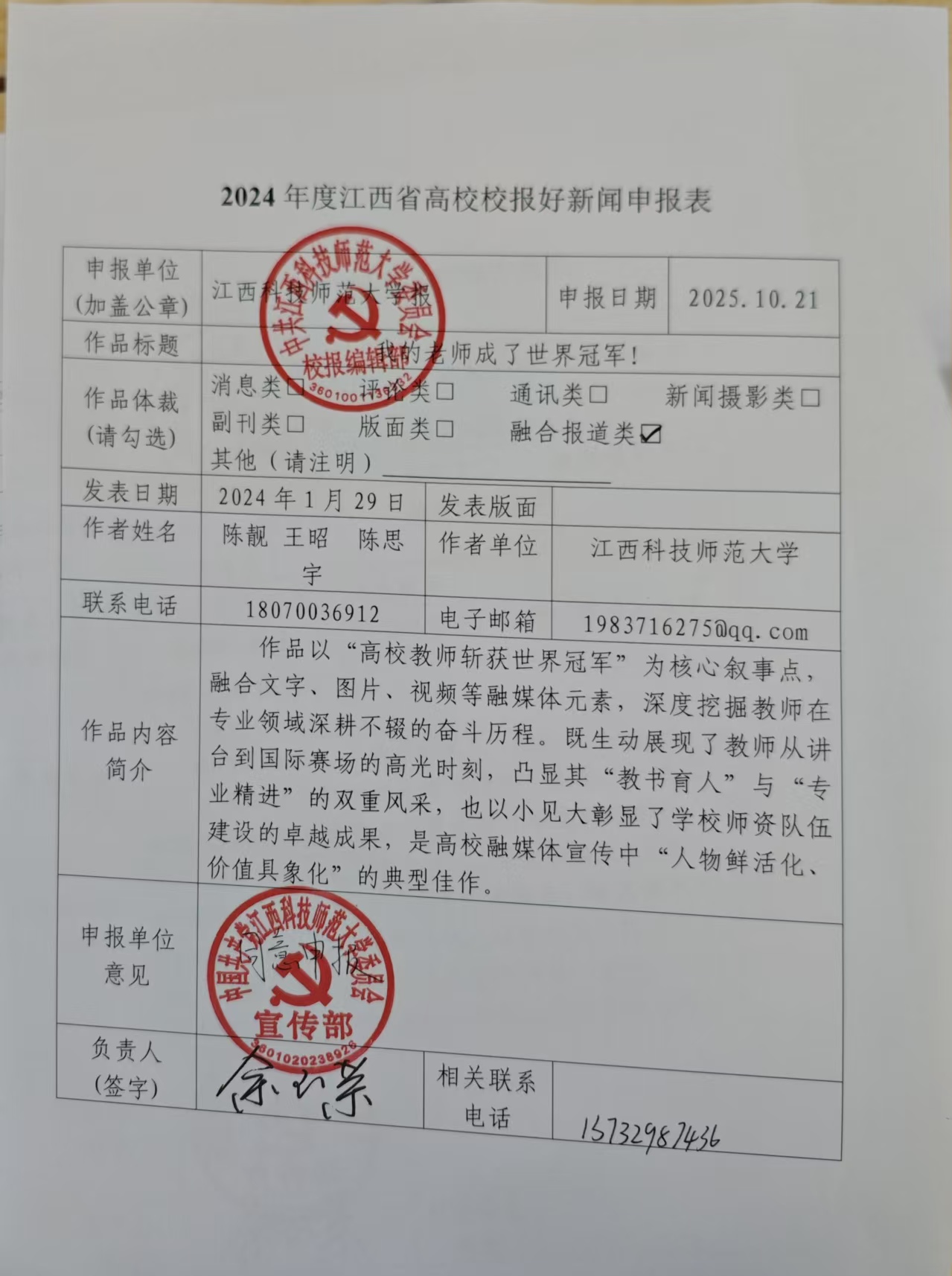 作品以“高校教师斩获世界冠军”为核心叙事点, 融合文字、图片、视频等融媒体元素,深度挖掘教师在 专业领域深耕不辍的奋斗历程。既生动展现了教师从讲 台到国际赛场的高光时刻,凸显其“教书育人”与“专 业精进”的双重风采,也以小见大彰显了学校师资队伍 建设的卓越成果,是高校融媒体宣传中“人物鲜活化、 价值具象化”的典型佳作。