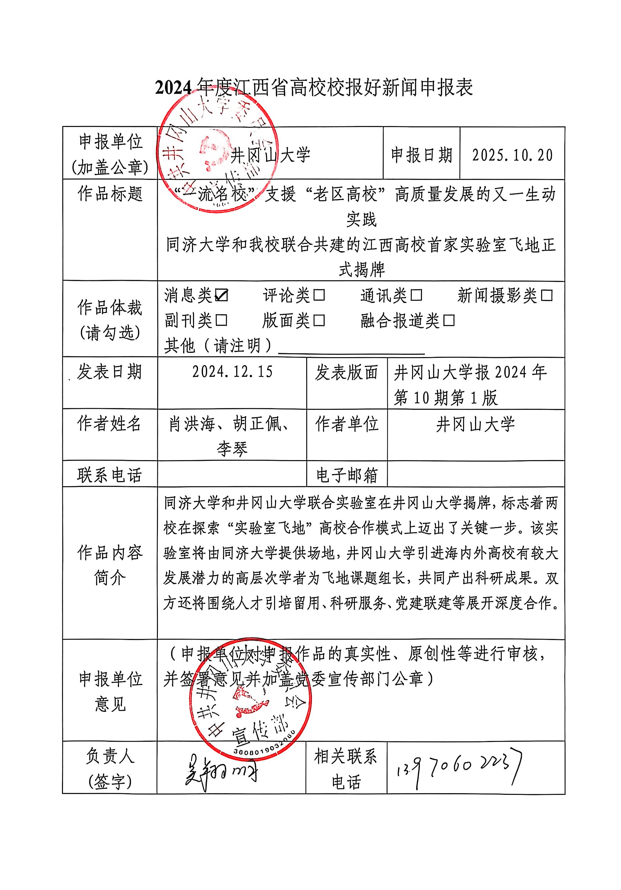 同济大学挂职干部、井冈山大学校长助理、联合实验室主任张赫表示,联合实验室的成立将破解井冈山大学面临的人才引进与高水平成果产出难题,吸引更多高层次人才依托飞地投身老区科研教育事业,提升师生科研素养与创新能力,促进基础科研项目开展与成果转化,带动老区高等教育办学水平和科技能力的整体提升。同济大学将持续加大支援帮扶力度,推动双方对口合作向纵深拓展,助力革命老区在教育与科研领域取得更大突破与进步,并成为同济大学对口支援井冈山大学的重要载体与创新高地。