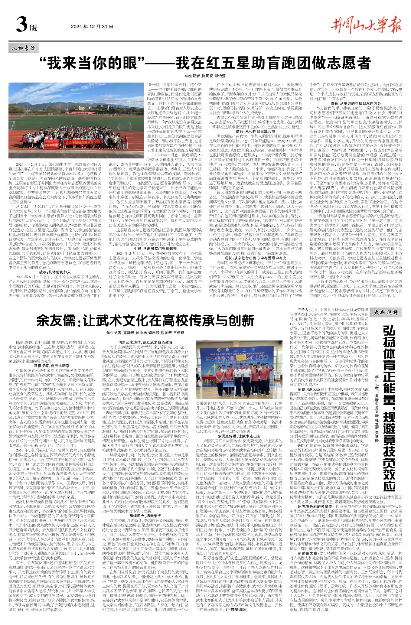 @C:在我看来,体育精神是追求卓越。它是运动员们始终以“更高、更快、更强”为目标,不断挑战自身极限;它是不抛弃、不放弃,坚持到最后一秒的执着坚守;它更是彼此的支持与鼓励,体现团结的力量。在商业化和功利化的浪潮冲击着体育精神和运动现状的今天,或许有人将其视为娱乐或获利的手段,但真正的体育精神背后的精神价值,应该是在竞技赛场的舞台上,澎湃的激情与不屈的生命意志相撞,此时无惧挑战的生命之美熠熠生辉。运动员们在赛场上奋力拼搏,展现竞技风采;赛场外相互激励,搭建友谊桥梁。如今,我们传承体育精神,也许正是期望更多人以自身小我之力去铸就体育强国的大我之梦,以此传递不息,带着期望与梦想赶赴荣耀之旅。