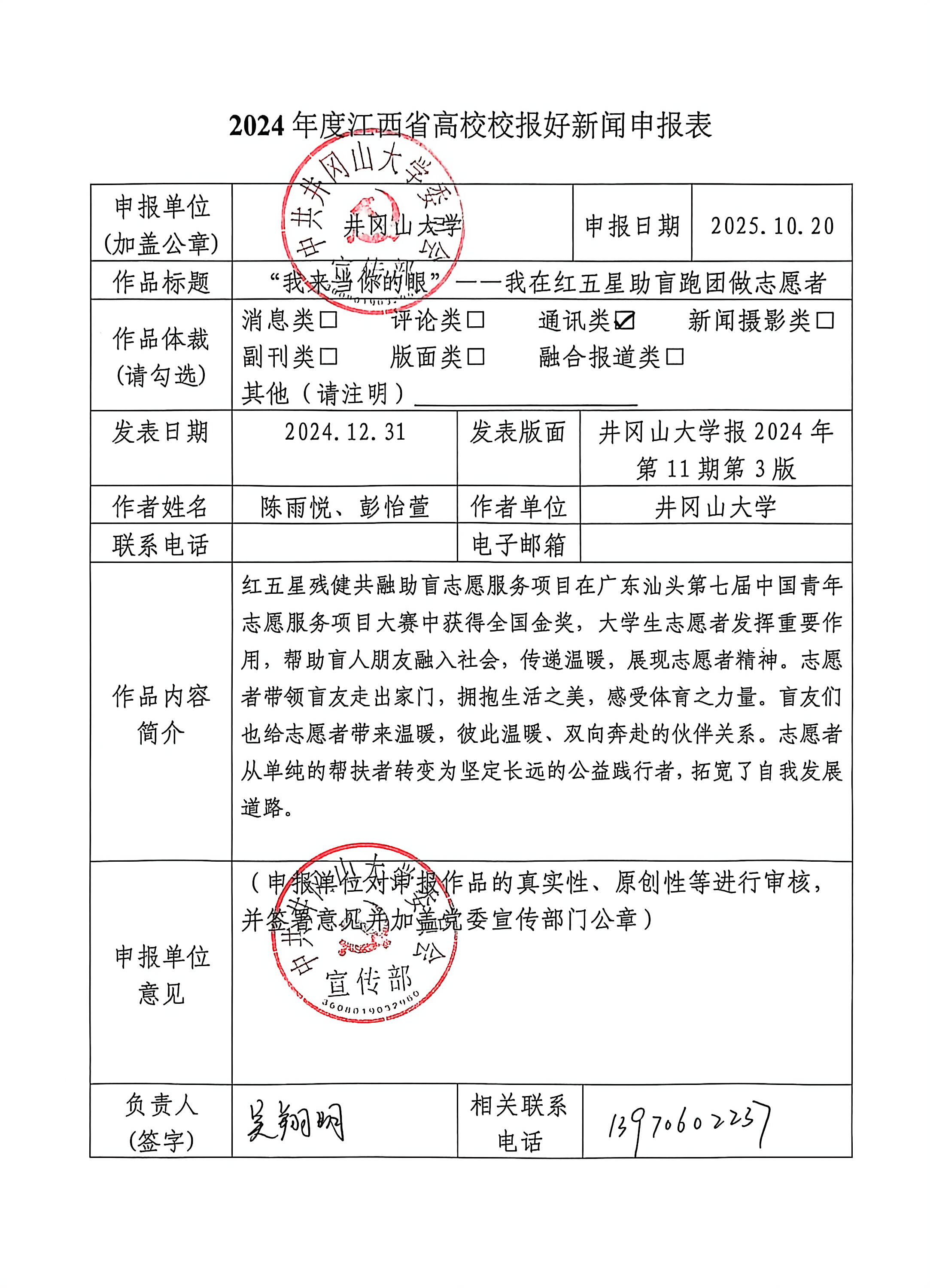2024 年 12 月 1 日, 第七届中国青年志愿服务项目大赛全国决赛在广东汕头圆满落幕,来自井冈山大学的《爱的光“盲”———红五星残健共融助盲志愿服务项目》获得了全国金奖, 这是江西省在阳光助残赛道上获得的首枚金牌。 这项荣誉彰显了井冈山大学在青年志愿服务领域的突出成就和将井冈山精神深度融入公益事业的坚定决心与卓越成效。 在赛事余热之下,由教师胡亮领导的红五星助盲跑团也日益突显在公众视野之下,传递着他们的红五星助盲公益精神……
