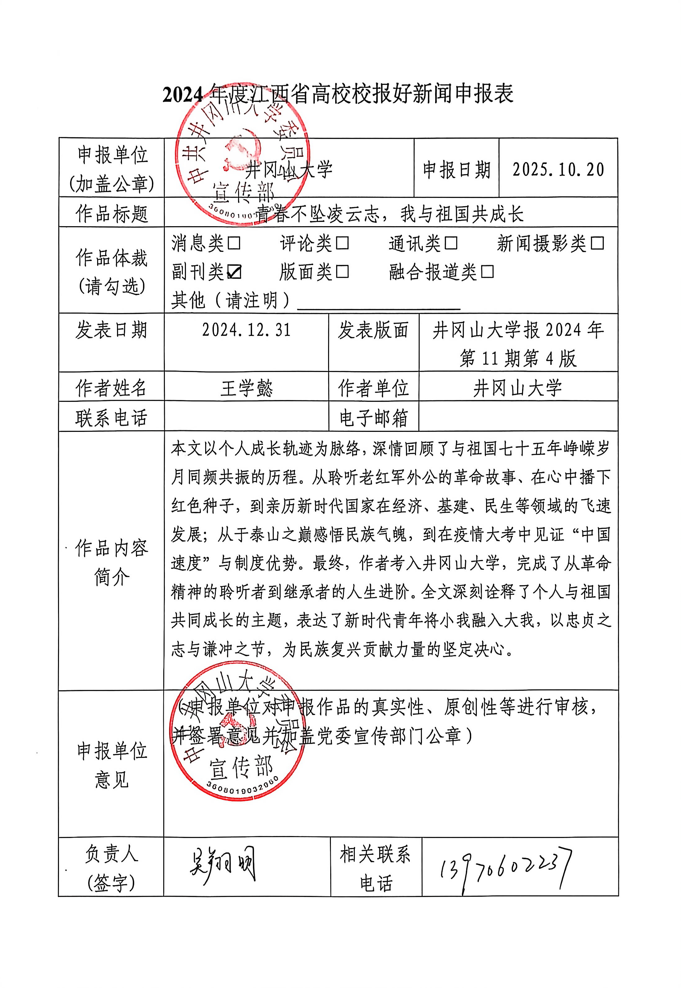 在祖国75岁华诞之际,我荣幸地考上了井冈山大学,可谓是国庆与家喜齐至。我不禁感慨:我难道不是与祖国一同成长吗?祖国现在综合国力不容小觑,我也练就了一定本领。祖国迎来了新的机遇,我也步入大学这个广阔的平台。祖国身处的国际形势变幻诡谲,我面临的挑战荆棘满途。值此盛典,新华社又传来万舰齐发、云端闯将、铁甲雄师的喜讯。作为时代新青年,我大可骄傲地说:炎黄挺直了脊梁,西北望满月弓射天狼!当年播种在我心中的种子早已长成,结出了矢志于党、尽忠于国的果实。