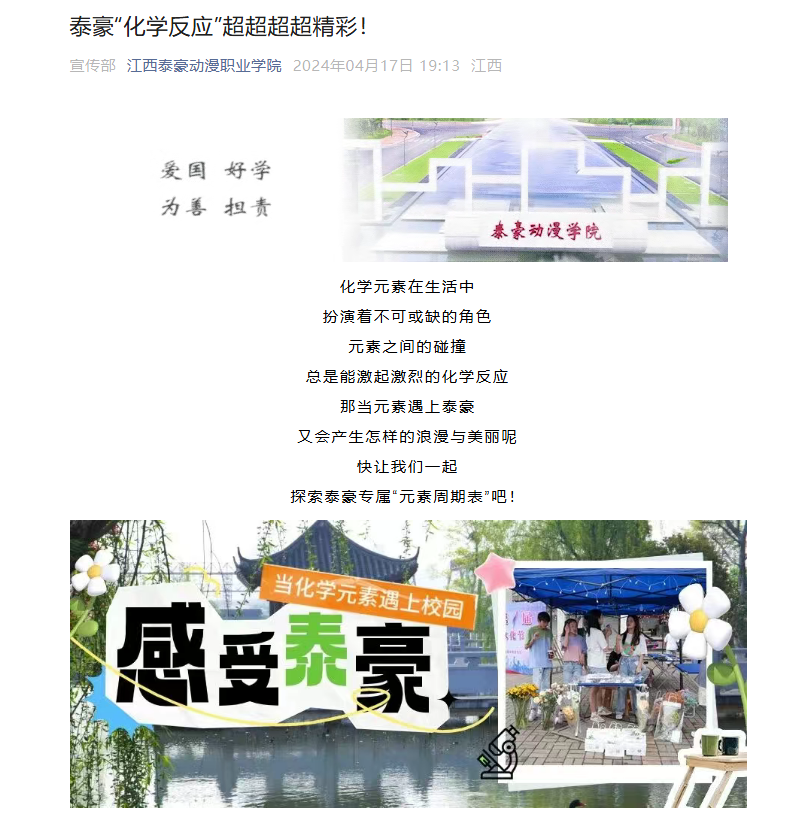 作品以“化学元素”为创意切入点,将学校人文风景、学生日常等核心内容,转化为可交互的“泰豪专属元素”。用户点击主图即可触发不同场景图片切换,如课堂求知瞬间、校园四季风光、社团活动剪影等,用新颖形式呈现校园生活全貌。