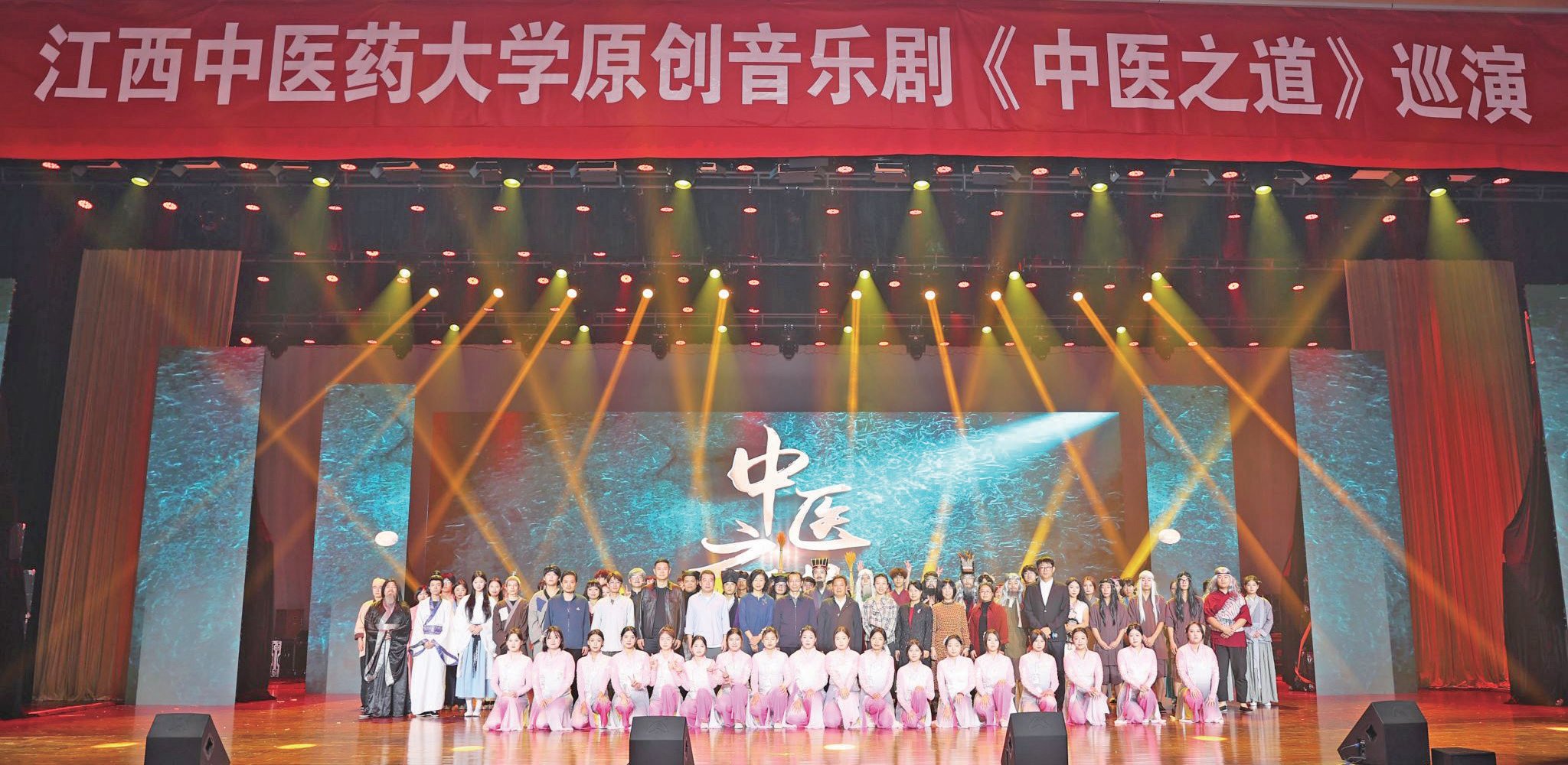 本报讯(通讯员 孙炜唯 周国强)11 月 13 日,由我校人文学院原创的音乐剧《中医之道》在神曲厅完成首站巡演,演员们用精湛的表演将中医药的历史典故、名医故事等一一呈现,为观众带来了一场穿越时空的中医药文化体验。学校党委副书记章德林、党委委员徐道富以及党委宣传部、学工处、团委、人文学院等部门负责人、师生代表 1000 余人观看演出。