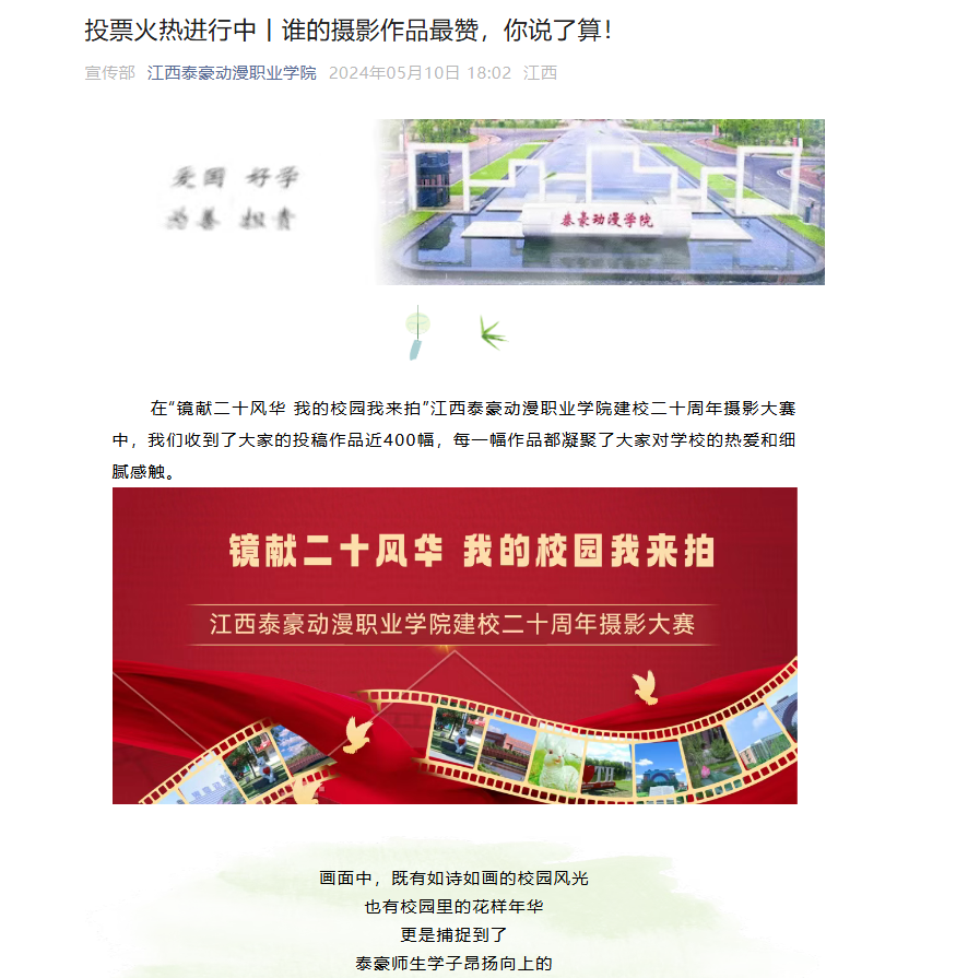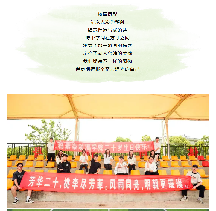 在“镜献二十风华 我的校园我来拍”江西泰豪动漫职业学院建校二十周年摄影大赛中,我们收到了大家的投稿作品近400幅,每一幅作品都凝聚了大家对学校的热爱和细腻感触。画面中,既有如诗如画的校园风光,也有校园里的花样年华,更是捕捉到了泰豪师生学子昂扬向上的奋斗风采和精神风貌,留下了泰豪最珍贵的记忆。