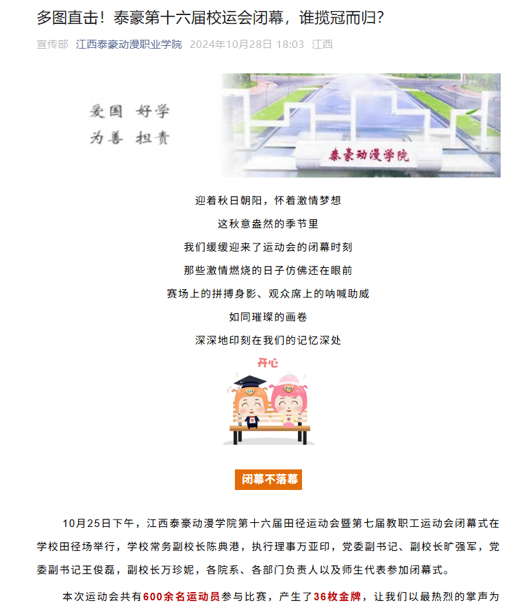 作品以泰豪第十六届校运会闭幕为主题,聚焦赛事精彩瞬间与冠军归属。内容涵盖短跑冲刺、跳高腾跃等竞技场景,以及运动员领奖、师生欢呼的温情画面,全方位展现校运会活力风采。