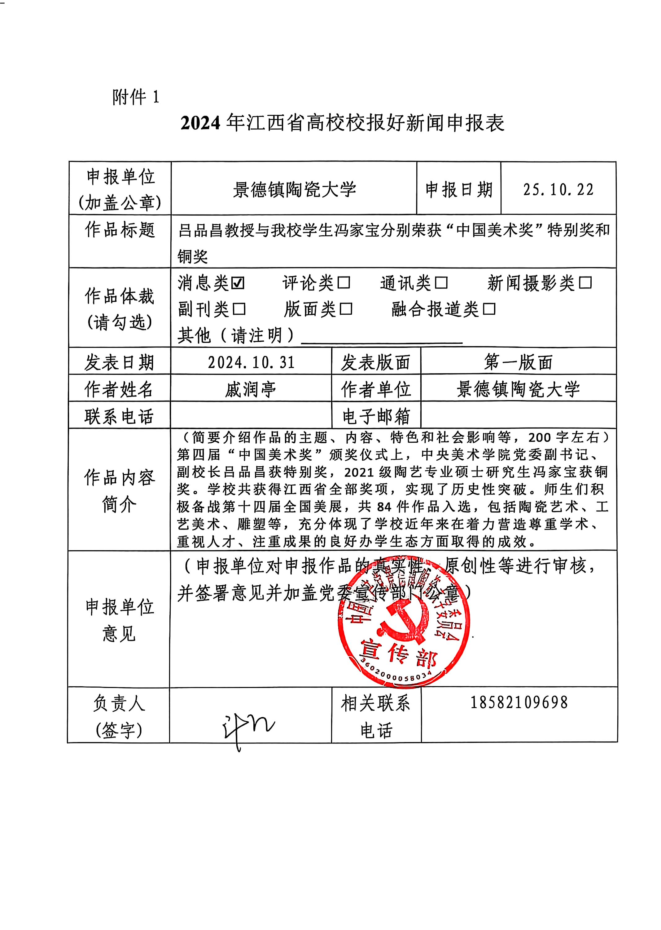 据悉,“中国美术奖”经中宣部批准设立,由中国文学艺术界联合会、中国美术家协会主办,旨在表彰那些为时代抒写、为人民抒怀的优秀美术作品,鼓励引导广大美术工作者攀登艺术高峰,书写生生不息的人民史诗。获奖作品从每五年一届的“全国美术作品展览”中产生,是美术领域国家级最高奖。第四届“中国美术奖”从第十四届全国美展7万多件投稿中评选产生金奖9件、银奖14件、铜奖17件。“中国美术奖”首次设立“特别奖”,经评委会提议并报中央批准,本次共颁发“特别奖”6项,分别是中国共产党历史展览馆主题雕塑《旗帜》《信仰》《伟业》《攻坚》《追梦》和漆壁画《长城颂》。第十四届全国美展举办以来,学校领导高度重视,有关师生积极备战,共有84件师生作品入选,包括陶瓷艺术60件、工艺美术8件、雕塑9件、壁画5件、艺术设计1件、中国画1件。其中,进京作品14件(含陶瓷艺术9件、雕塑3件、壁画1件、艺术设计1件),最终1件作品获“中国美术奖”铜奖,1人获“中国美术奖”特别奖,创造了我校在历届全国美展中的最佳成绩,充分体现了学校近年来在着力营造尊重学术、重视人才、注重成果的良好办学生态方面取得的成效。
