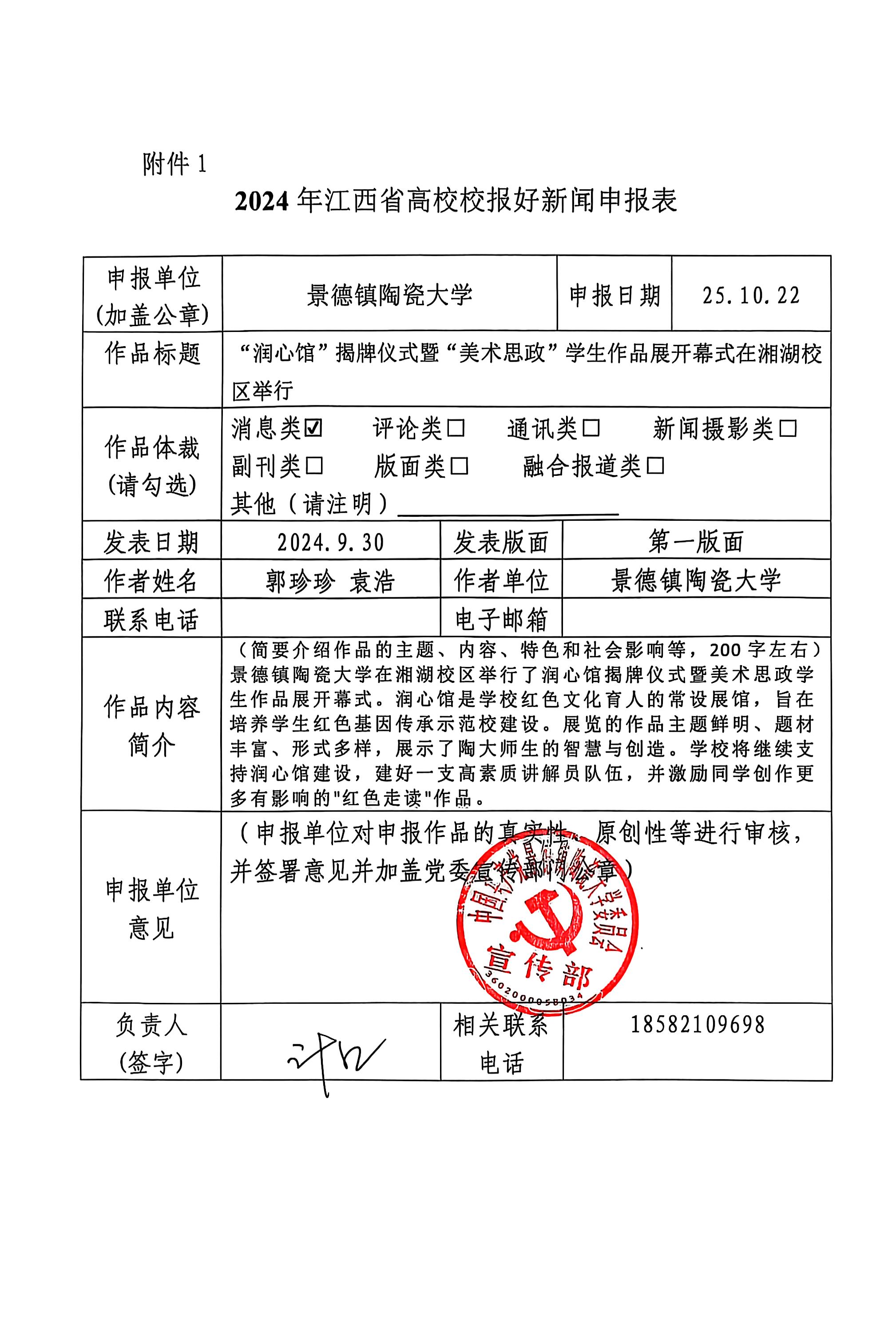 近年来,学校倾力打造"美术思政"红色文化育人品牌,陶大学子积极投身全省"红色走读"活动,从红色基因中汲取养分和灵感,创作了一大批饱含真情、影响广泛的红色文化艺术作品,在全国"挑战杯"红色专项、全省"红色走读"等活动中取得优异成绩,人民日报、中央电视台、新华社等媒体报道了学校"美术思政"做法。为推进红色文化育人常态化、长效化,学校党委研究决定建设学生红色文化艺术作品陈列馆--润心馆,作为学校红色文化育人常设展馆,也是景德镇陶瓷大学第一个学生作品常设展馆。