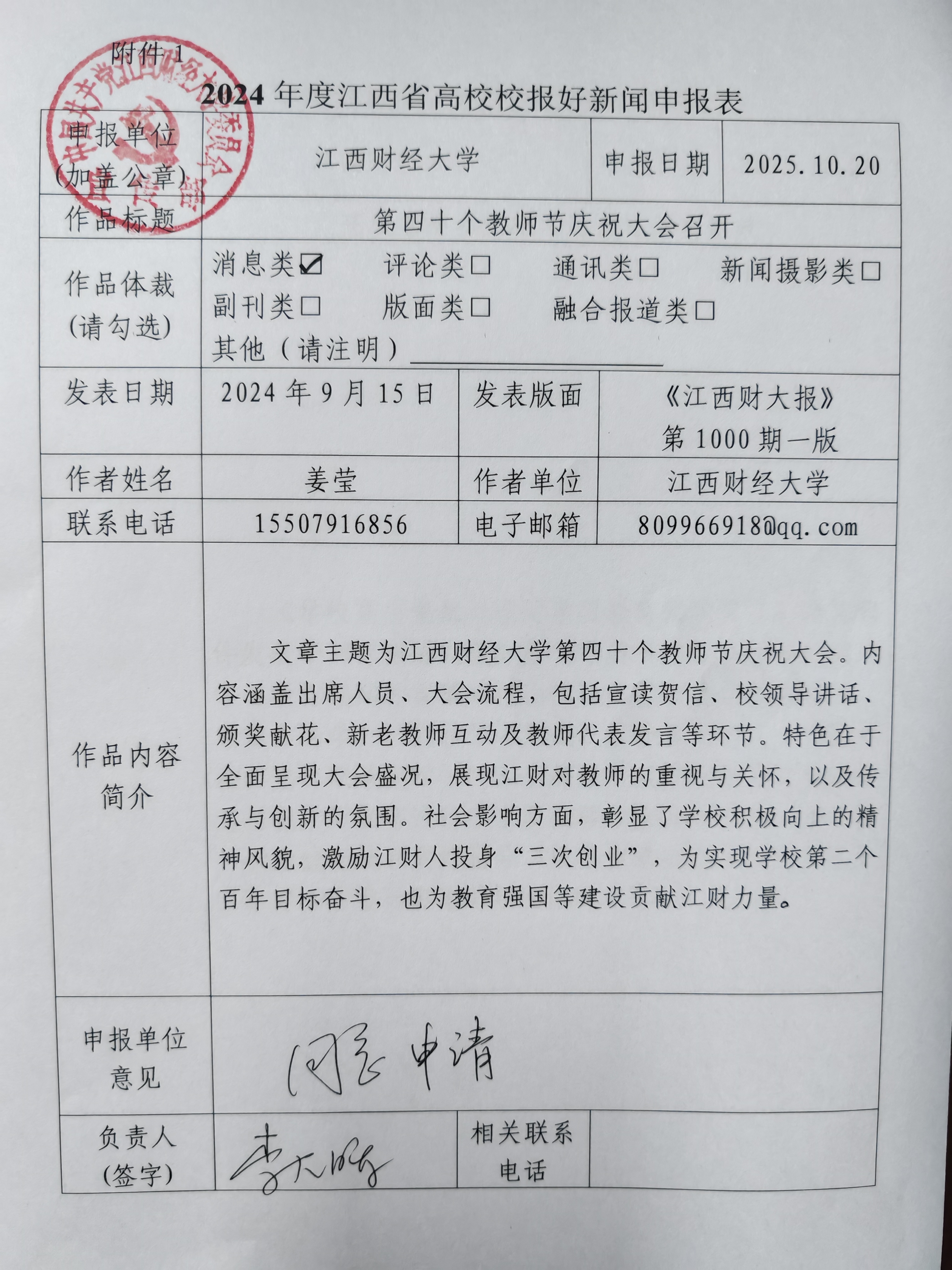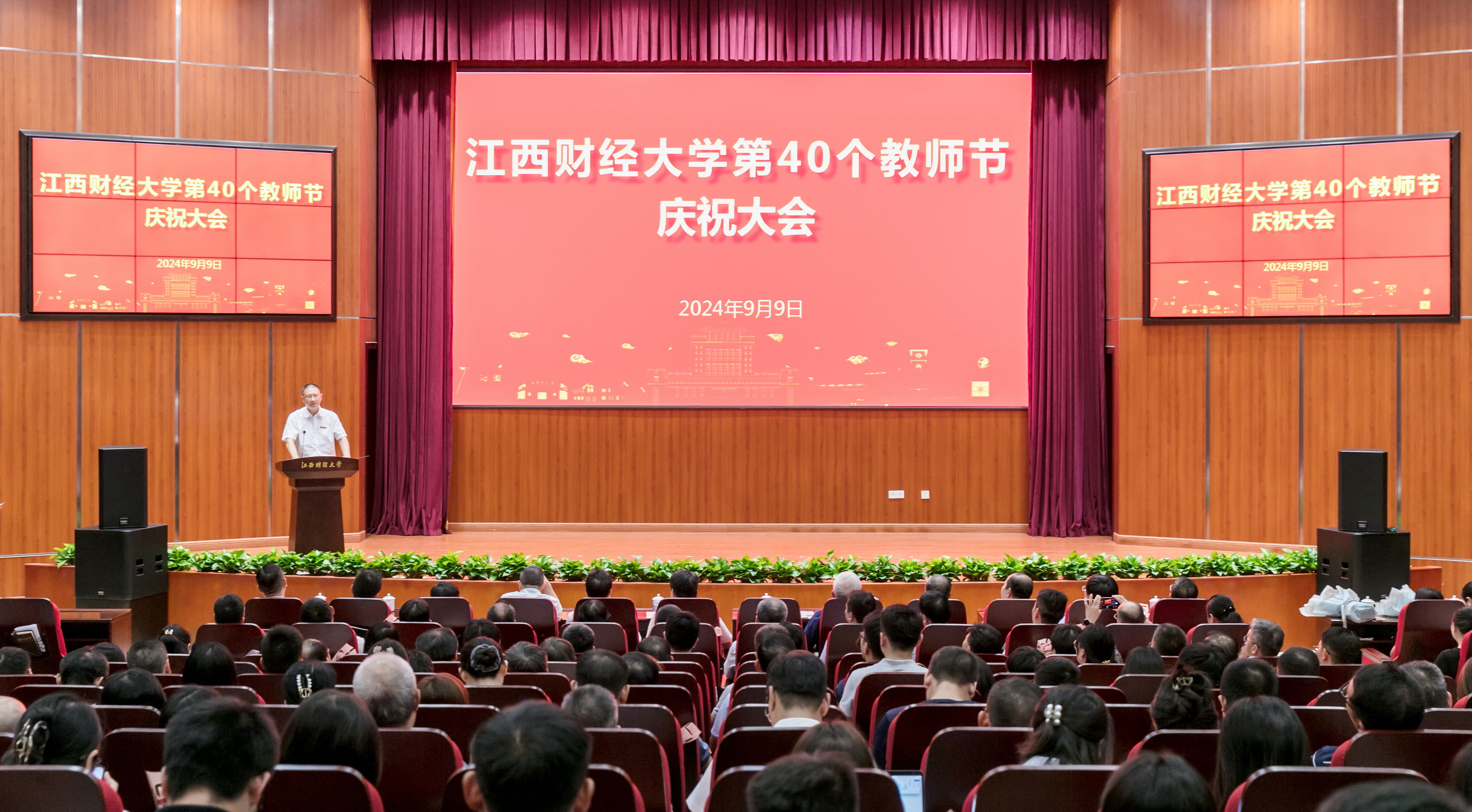本报讯(姜莹报道 李军摄影) 9月9日,我校召开第四十个教师节庆祝大会。校领导刘耀彬、邓辉、袁雄、阙善栋、顾有平、李春根、谢花林、方玉明出席大会。我校讲席教授、统计与数据科学学院名誉院长邱东,江西中至数据集团总裁、罗斯捷校友,江财MBA校友会秘书长刘志鹏校友,校属相关单位主要负责人、获奖教师代表、一线教师代表、离退休教师代表以及全体新入职教师参加大会。