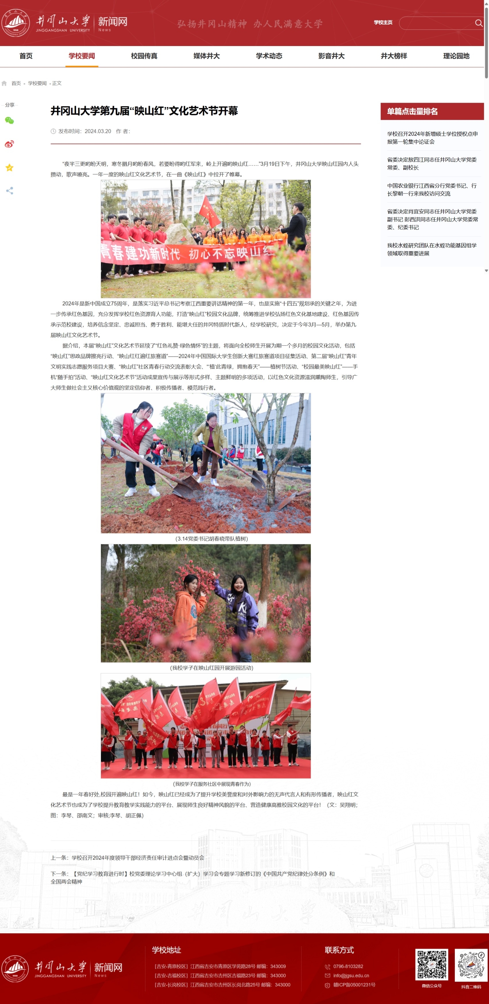 图片生动展现了学校第九届“映山红”文化艺术节的精彩瞬间,充分体现了学校以红色文化资源育人、培养具有井冈特质时代新人的坚定信念。整个画面洋溢着青春活力与红色激情,是校园文化品牌建设成果的直观呈现。