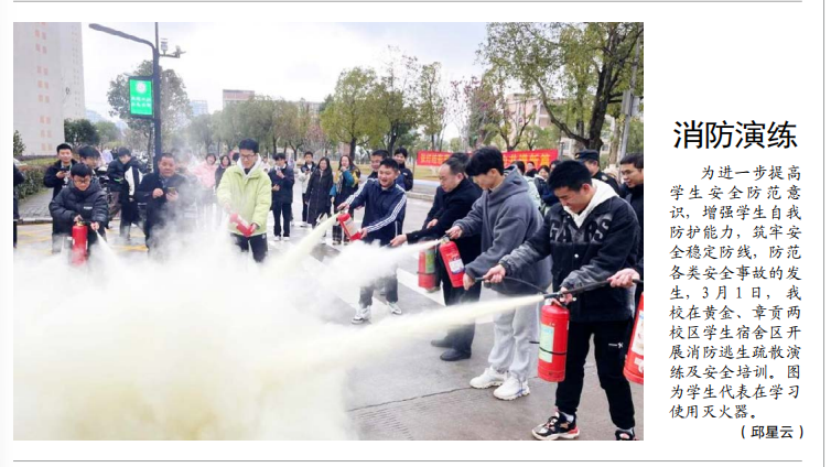 为进一步提高学 生 安 全 防 范 意识,增强学生自我防护能力,筑牢安全稳定防线,防范各类安全事故的发生,3 月 1 日, 我校在黄金、章贡两校区学生宿舍区开展消防逃生疏散演练及安全培训。图为学生代表在学习使用灭火器。(邱星云)