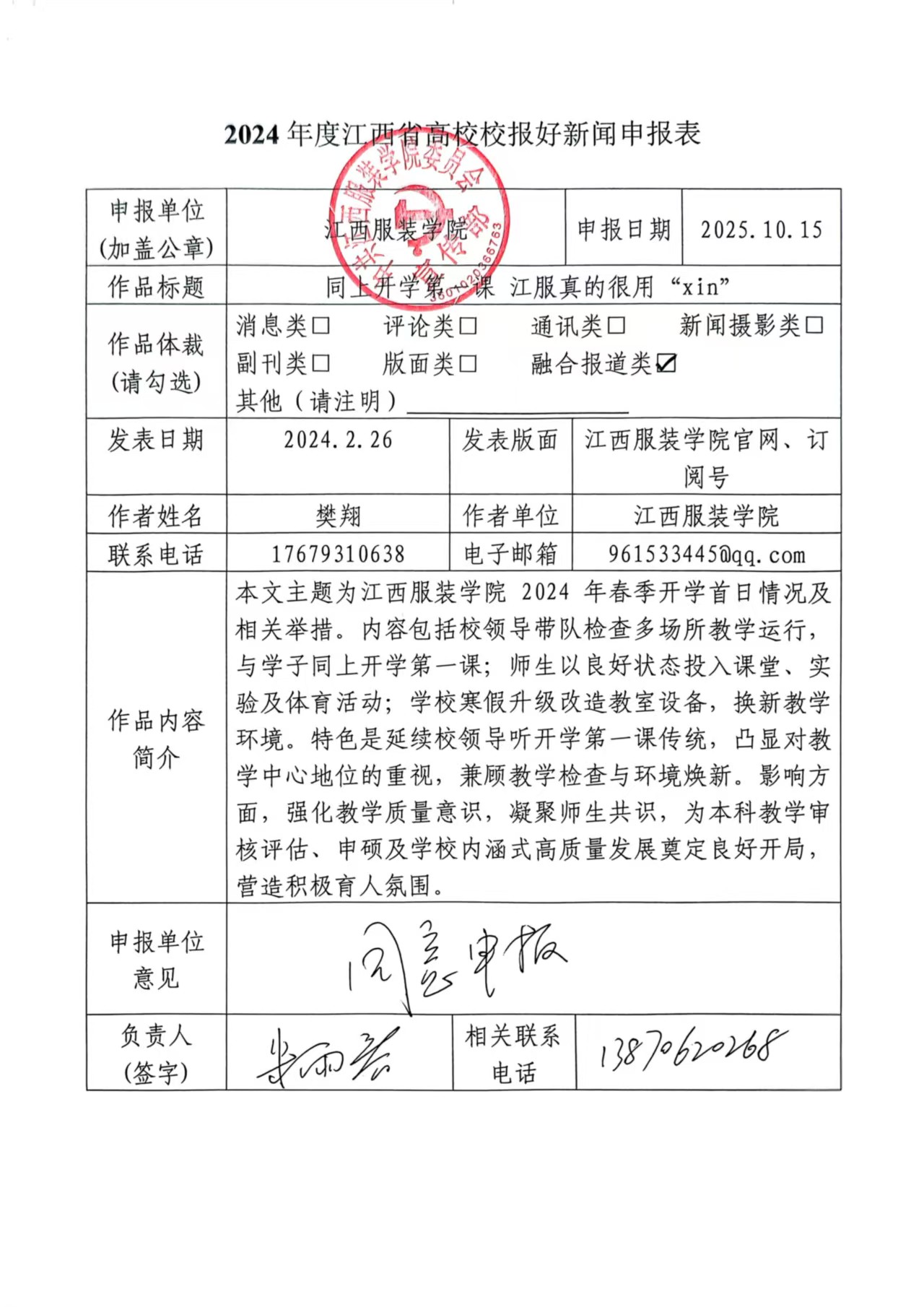 校领导启“新”航 同上第一课 校领导在教务处、学工处、质量监测与评估中心及各学院负责人的陪同下对主教学楼、艺术楼、艺术与传媒创意中心、东区实验基地、体育馆等场所的教学基础设施运行、教师到岗、学生到课、课堂秩序与教学等情况进行了细致地检查。 师生“心”相连 悦享课堂展风采 教室内,教师们精神抖擞,满怀激情地传授知识,学生们正襟危坐,聚精会神地学习知识。实验室内,师生互动频繁,学习氛围浓厚。体育馆内,同学们在运动中展现出了青春的活力和热情,享受着运动带来快乐。师生们都以最佳状态迎接新学期的挑战。 教室“新”风貌 资源升级焕新颜 寒假期间,江服投入大量资源,对部分教室及教学设备进行了升级改造,全面翻新的教室、最新加装的智能电子班牌以及全网联动的智能校园平安平台等,旨在为师生们提供更加舒适、高效的学习环境。相信在新学期到来之际,师生们将能够在新环境中更好地开展教学活动,共同书写学校发展的新篇章。 校领导与学生同听开学第一课,是江西服装学院一直以来坚持的优良传统。这不仅彰显了我校对于落实教学工作中心地位的重视程度,更有利于我校全体教职工,统一思想、凝聚共识,切实提高课堂教学质量和水平,进一步筑牢本科教学中心地位,高质量推进迎接本科教育教学审核评估和申硕各项工作,积极推动学校本科教育高质量发展再上新台阶,为学校高质量内涵式发展开好局、起好步。